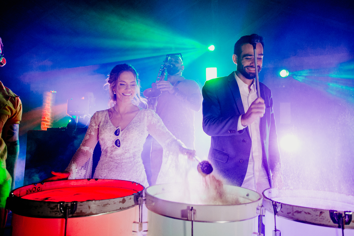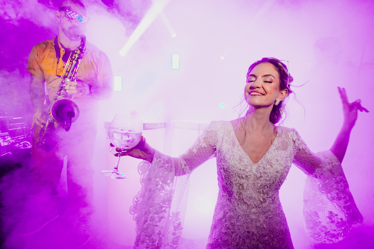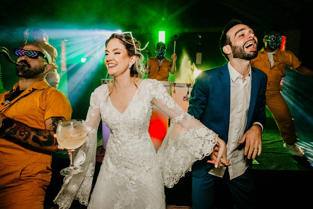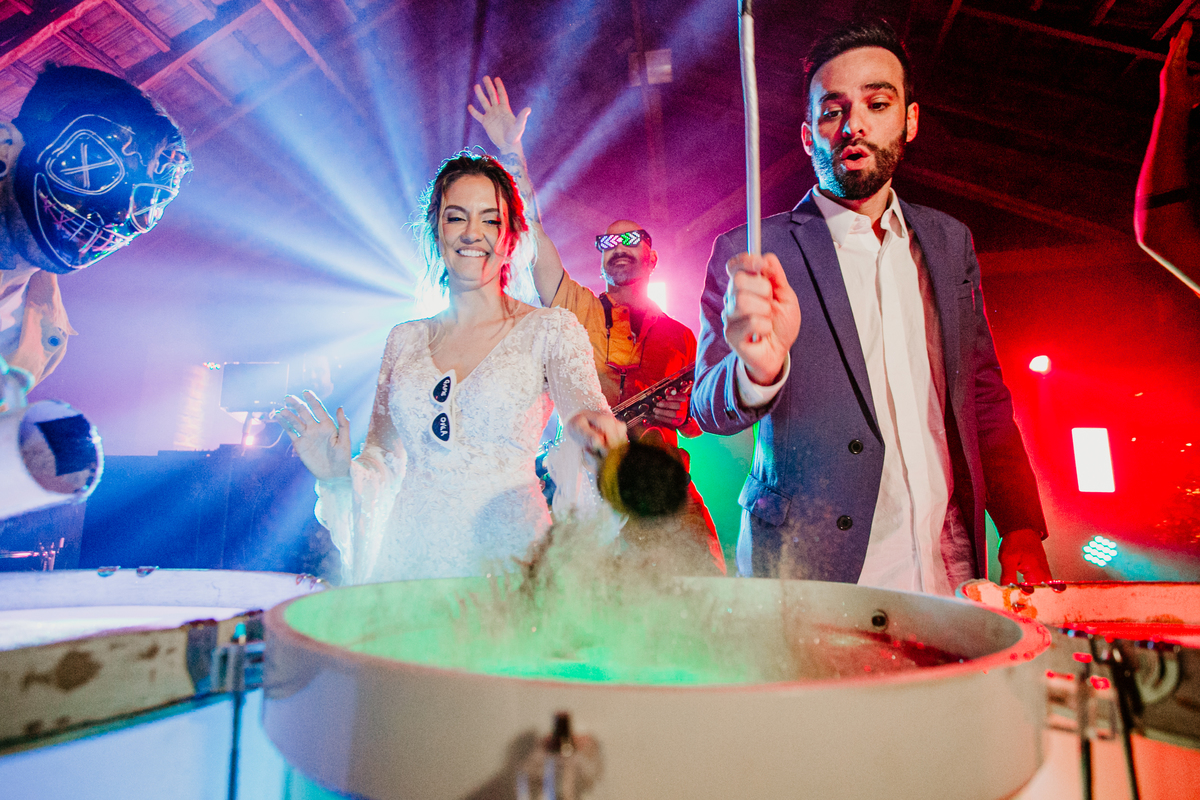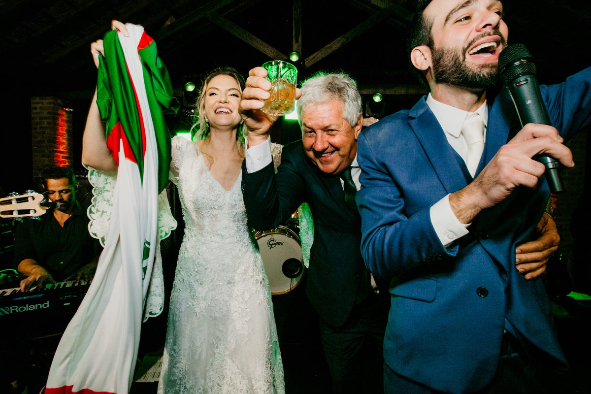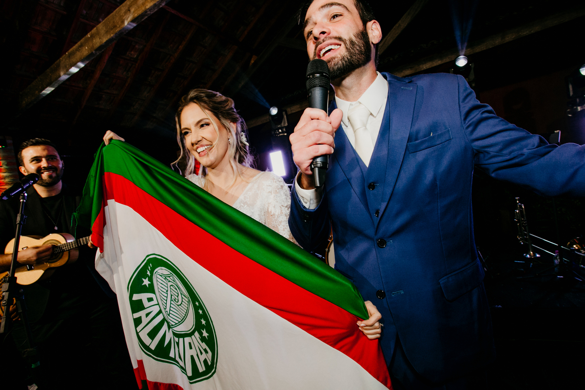 Depois, foi a vez da festa ganhar vida! A energia era contagiante, e a pista ferveu com uma banda ao vivo, seguida por um grupo de eletrohouse com saxofone e muito LED que levou a galera à loucura,. O ponto alto da noite, para os palmeirenses de coração, foi quando o casal não resistiu e puxou o hino do Palmeiras, exibindo a bandeira com orgulho para os convidados.