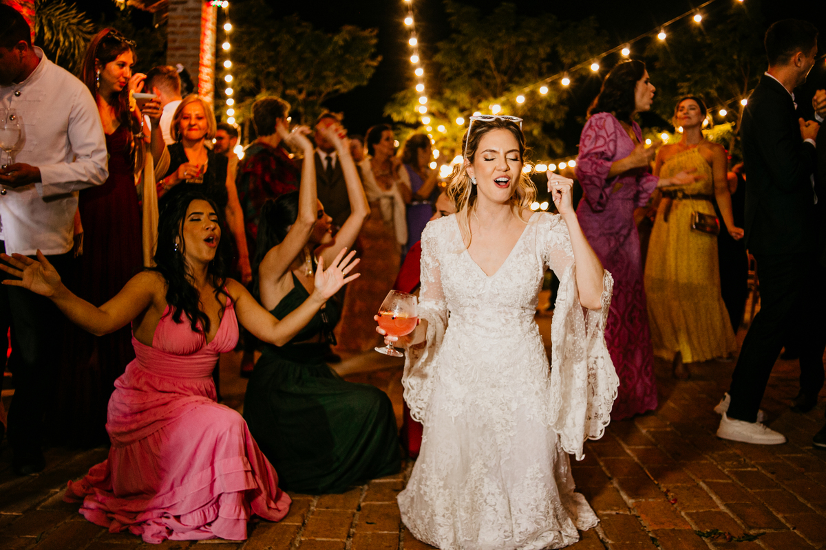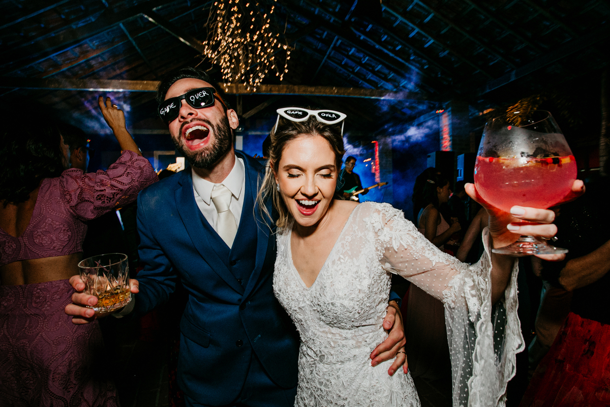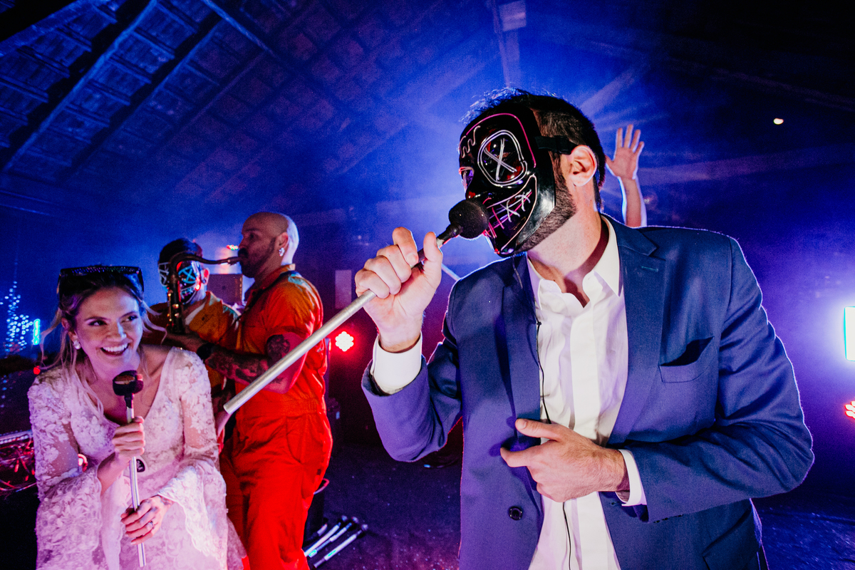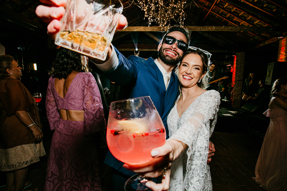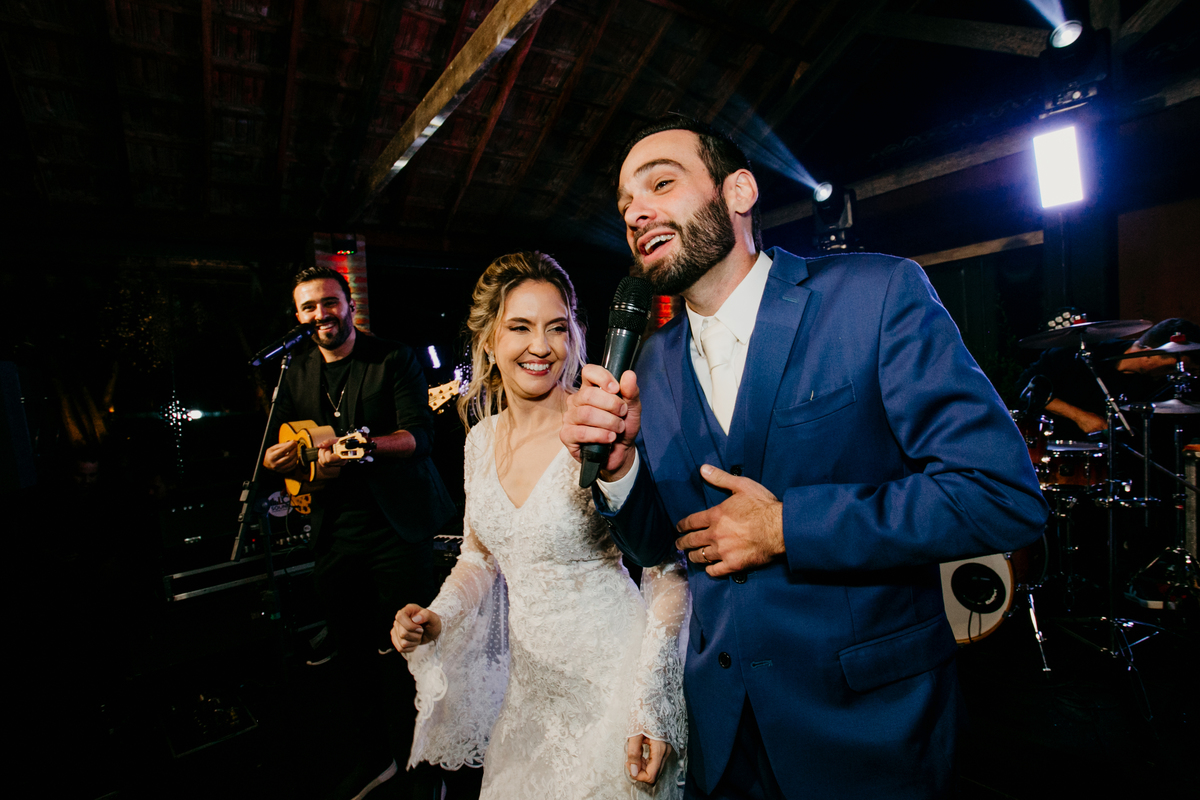 Depois, foi a vez da festa ganhar vida! A energia era contagiante, e a pista ferveu com uma banda ao vivo, seguida por um grupo de eletrohouse com saxofone e muito LED que levou a galera à loucura,. O ponto alto da noite, para os palmeirenses de coração, foi quando o casal não resistiu e puxou o hino do Palmeiras, exibindo a bandeira com orgulho para os convidados.