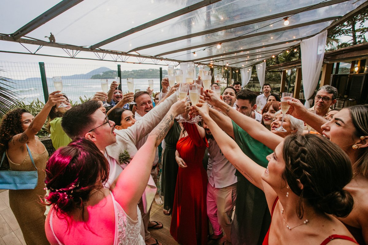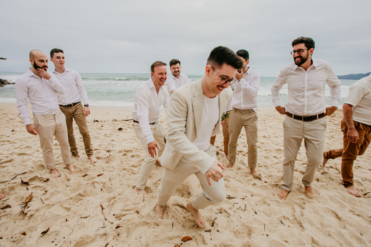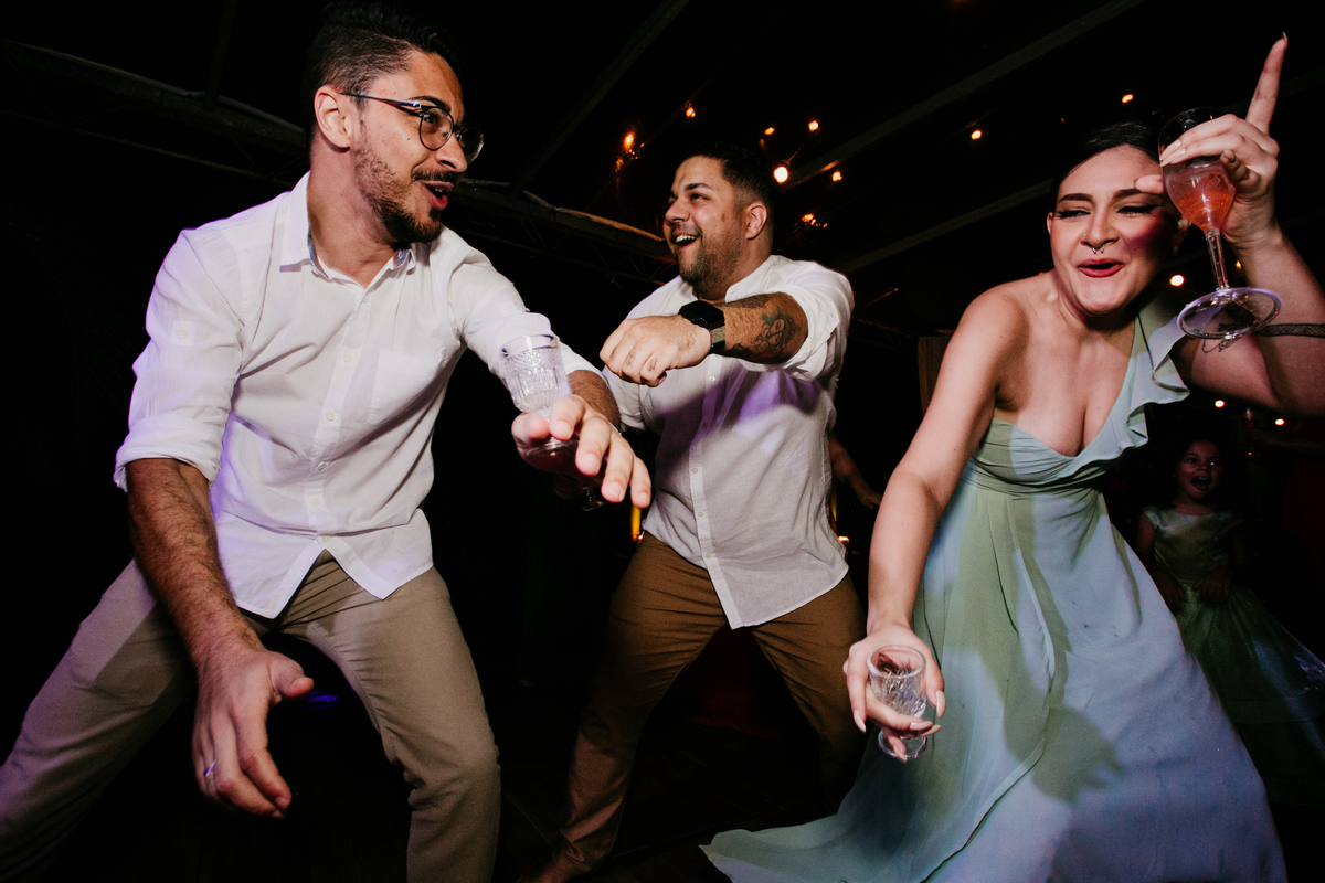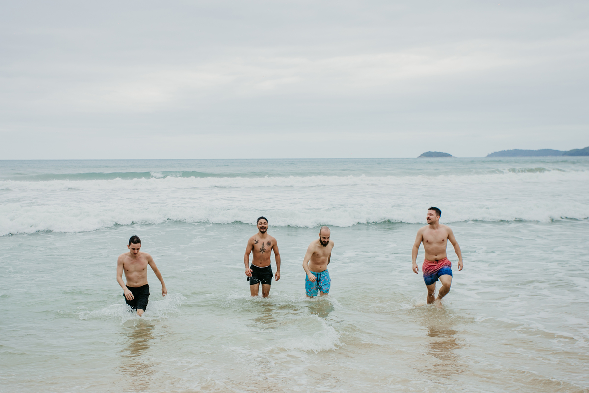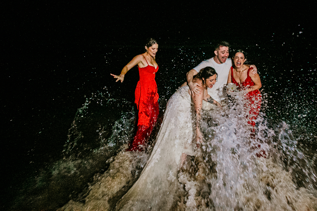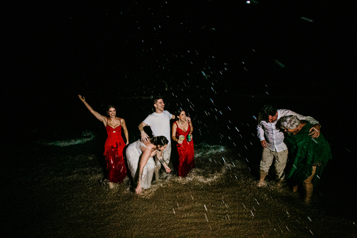 Apesar de ser uma festa pequena, a galera se jogou! Todos se divertiram como se não houvesse amanhã: muita bebida, risadas e aquela energia contagiante. Pra fechar o dia da melhor forma, o casal e os convidados foram direto para o mar, se molhar, curtir o momento e ainda pularam ondas, em uma vibe de renovação e boas energias.