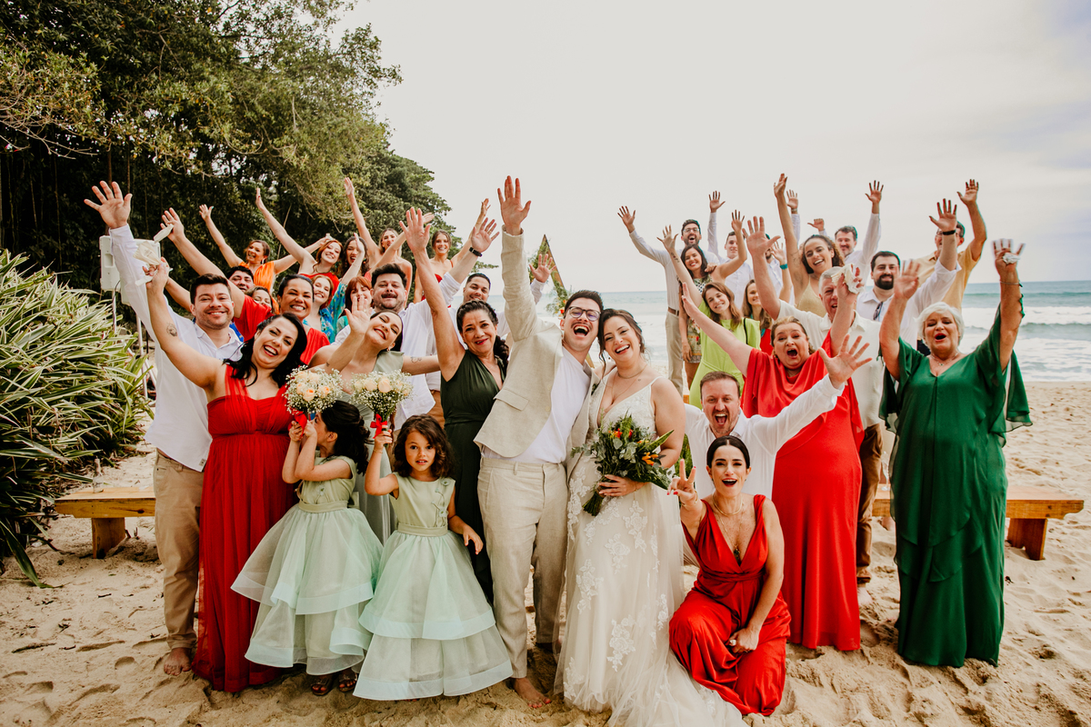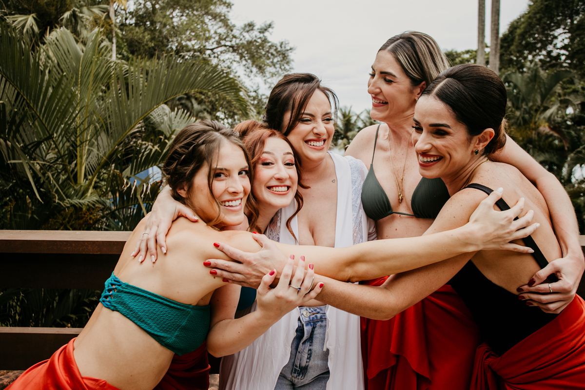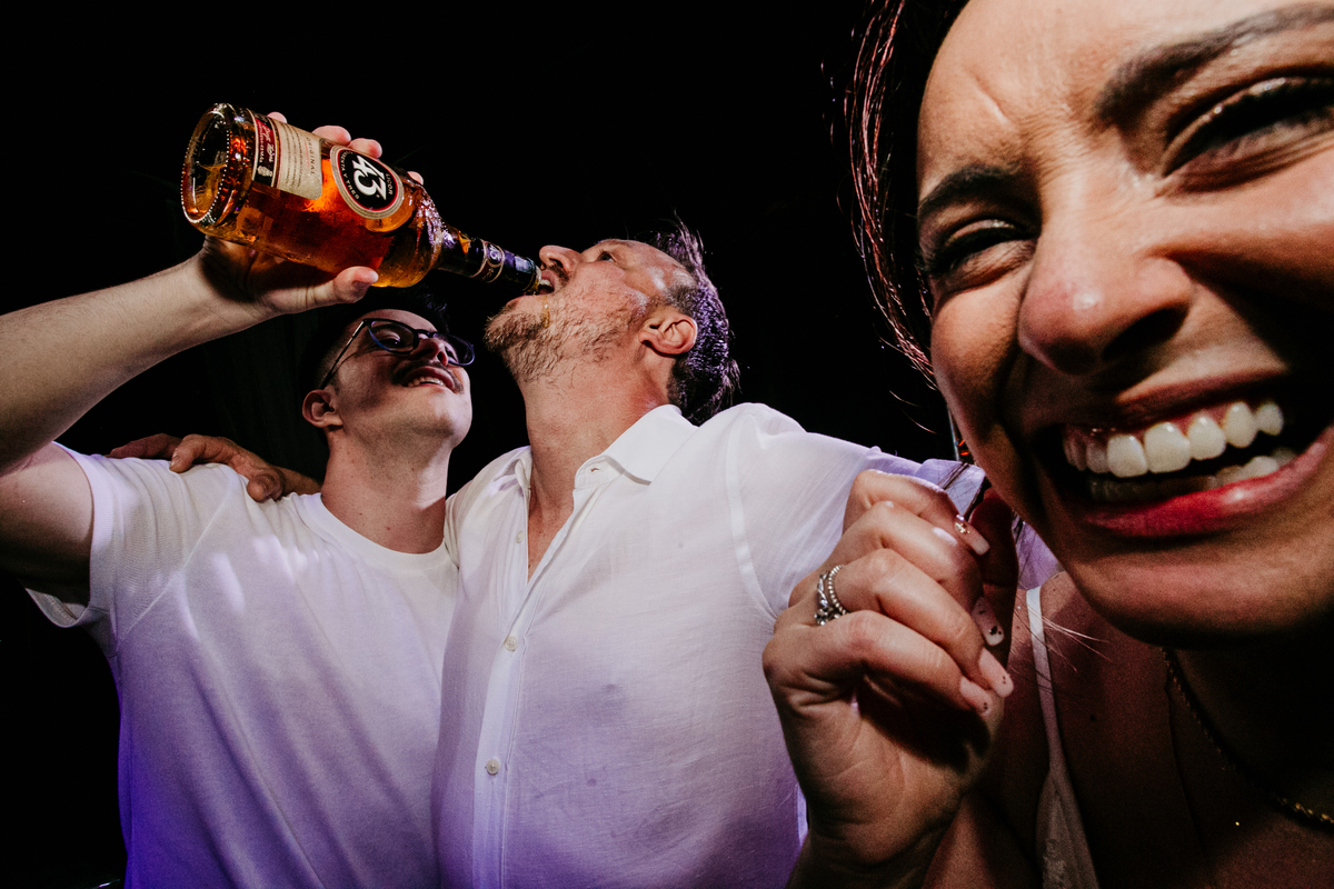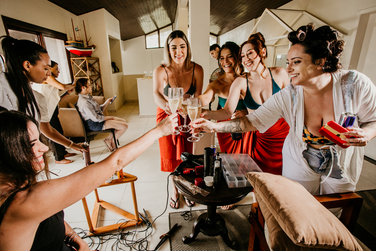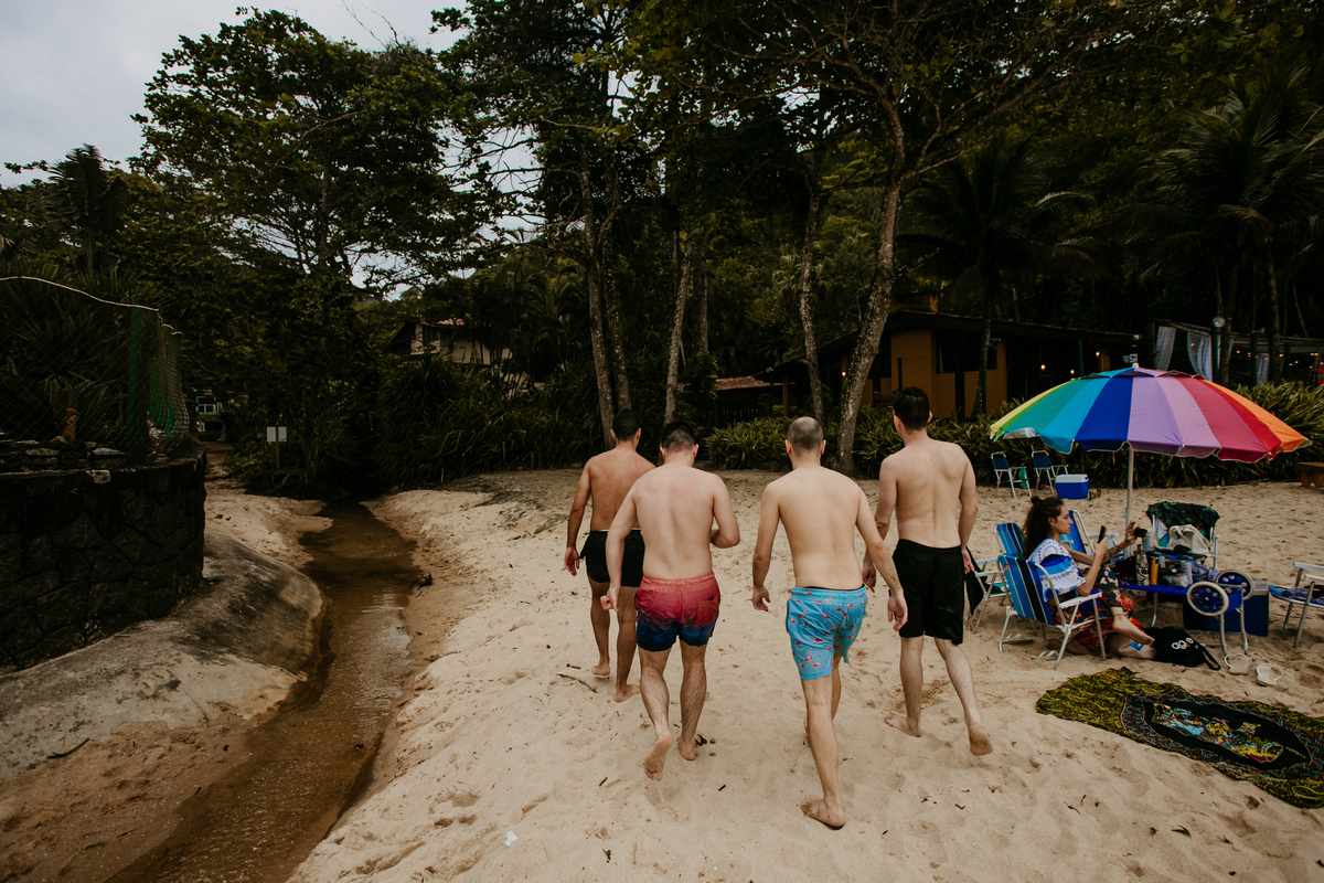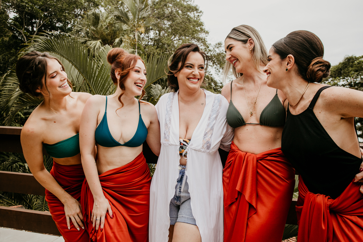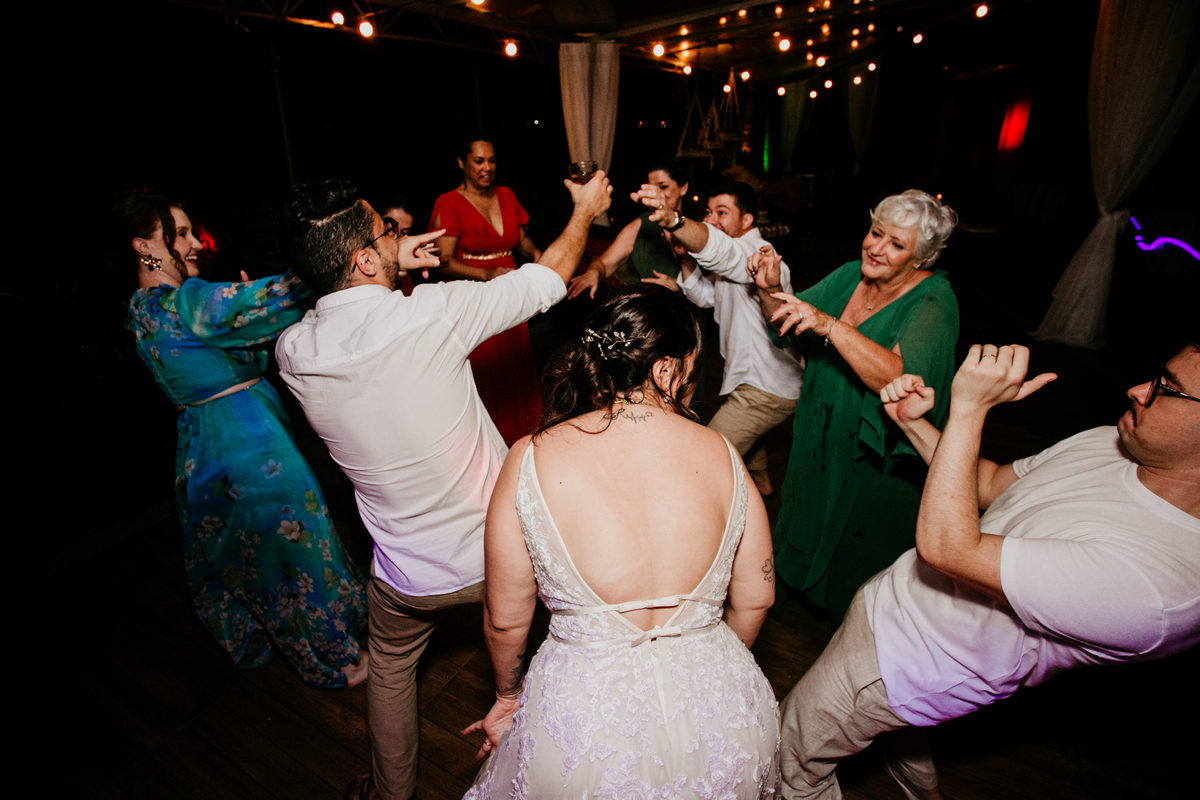 Apesar de ser uma festa pequena, a galera se jogou! Todos se divertiram como se não houvesse amanhã: muita bebida, risadas e aquela energia contagiante. Pra fechar o dia da melhor forma, o casal e os convidados foram direto para o mar, se molhar, curtir o momento e ainda pularam ondas, em uma vibe de renovação e boas energias.