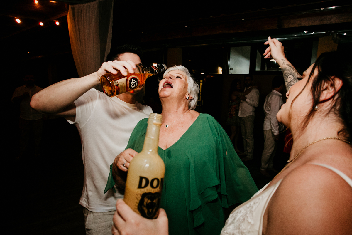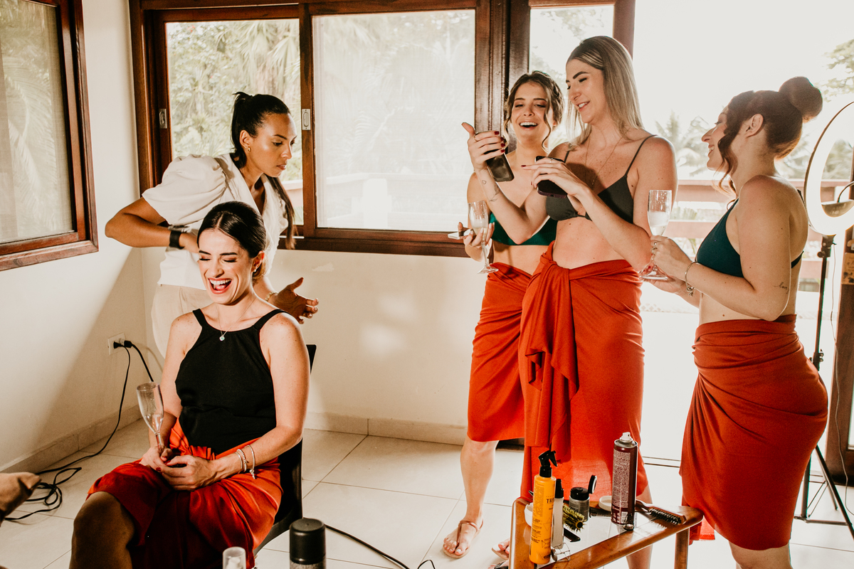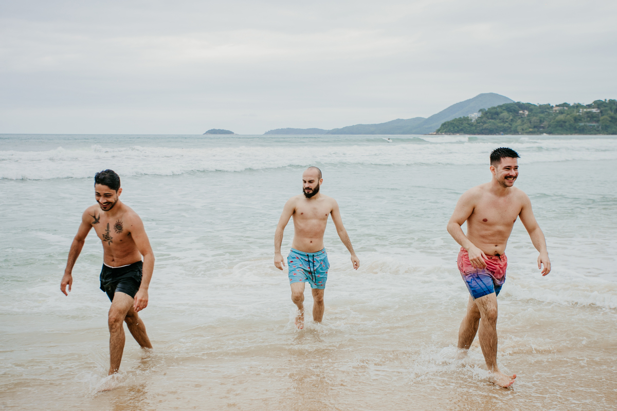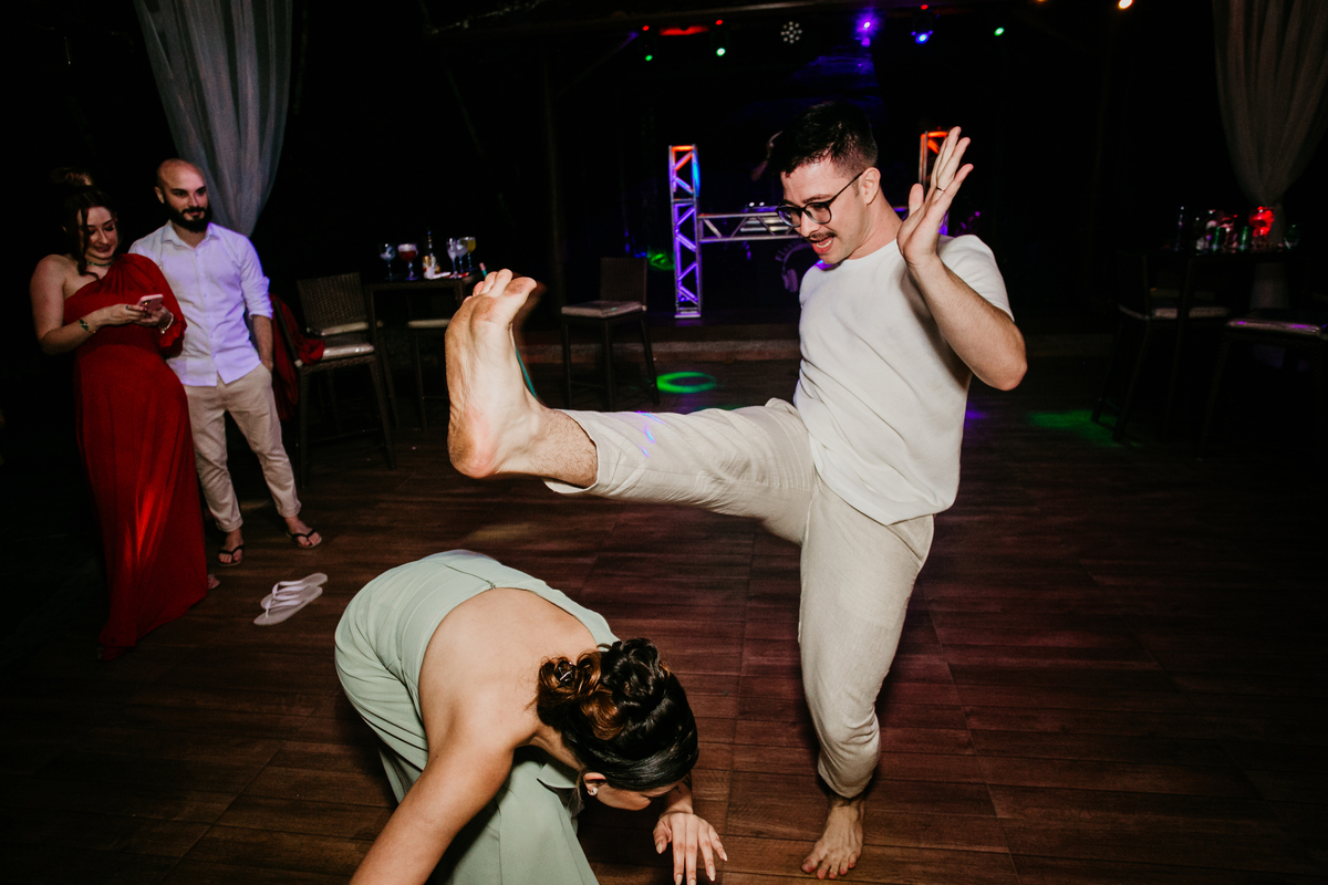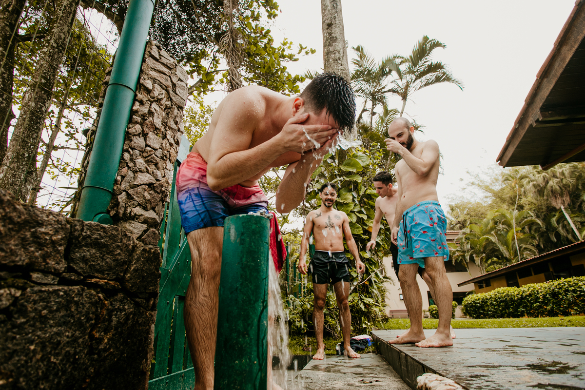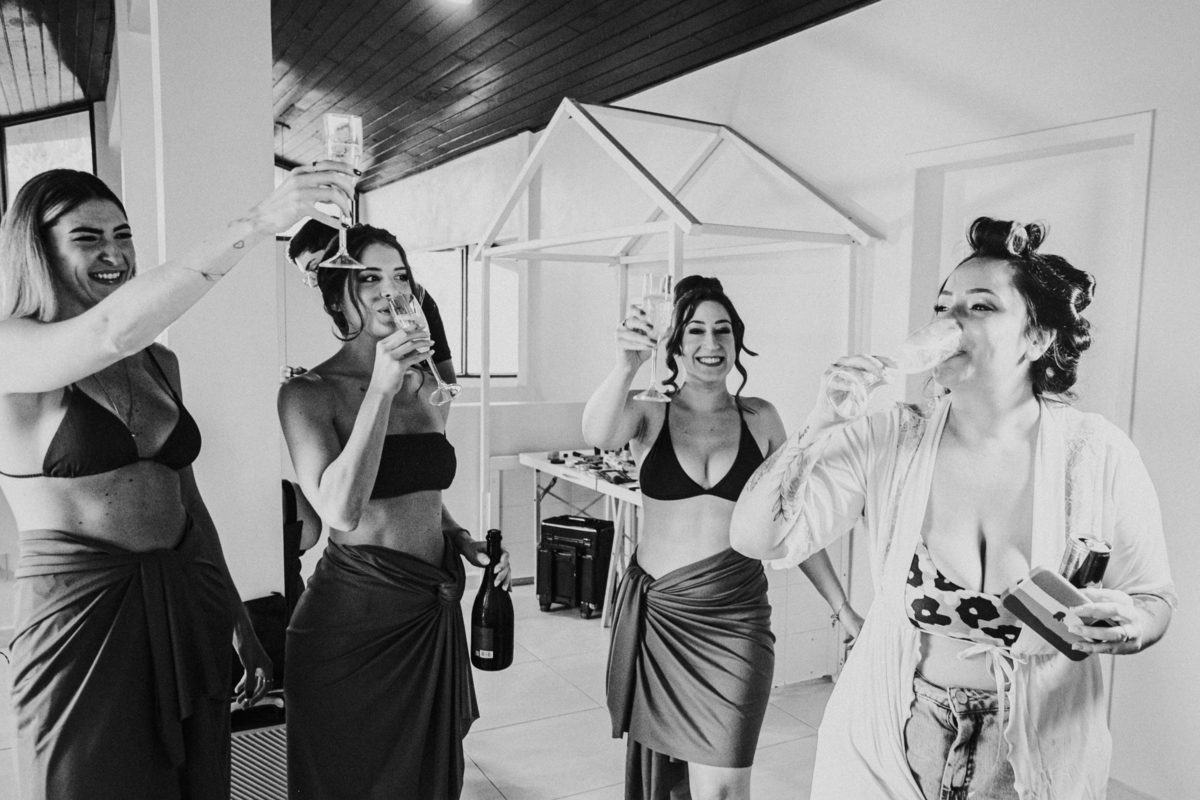 Apesar de ser uma festa pequena, a galera se jogou! Todos se divertiram como se não houvesse amanhã: muita bebida, risadas e aquela energia contagiante. Pra fechar o dia da melhor forma, o casal e os convidados foram direto para o mar, se molhar, curtir o momento e ainda pularam ondas, em uma vibe de renovação e boas energias.