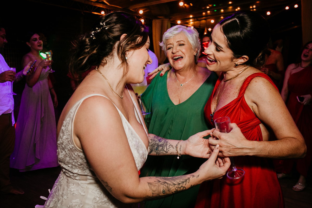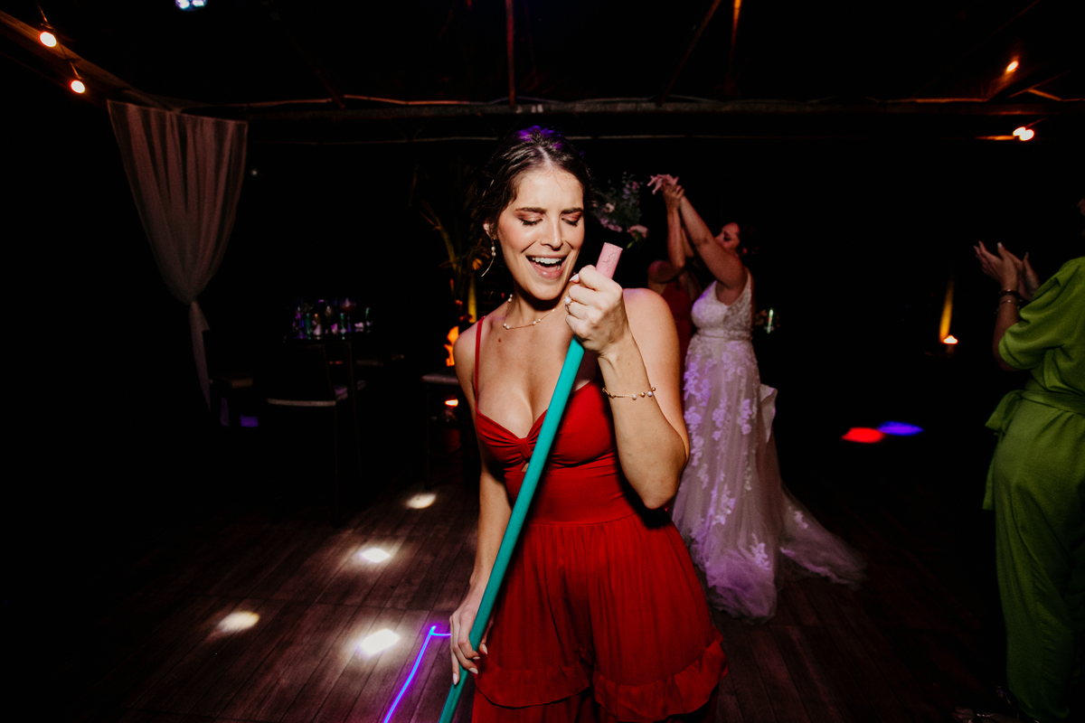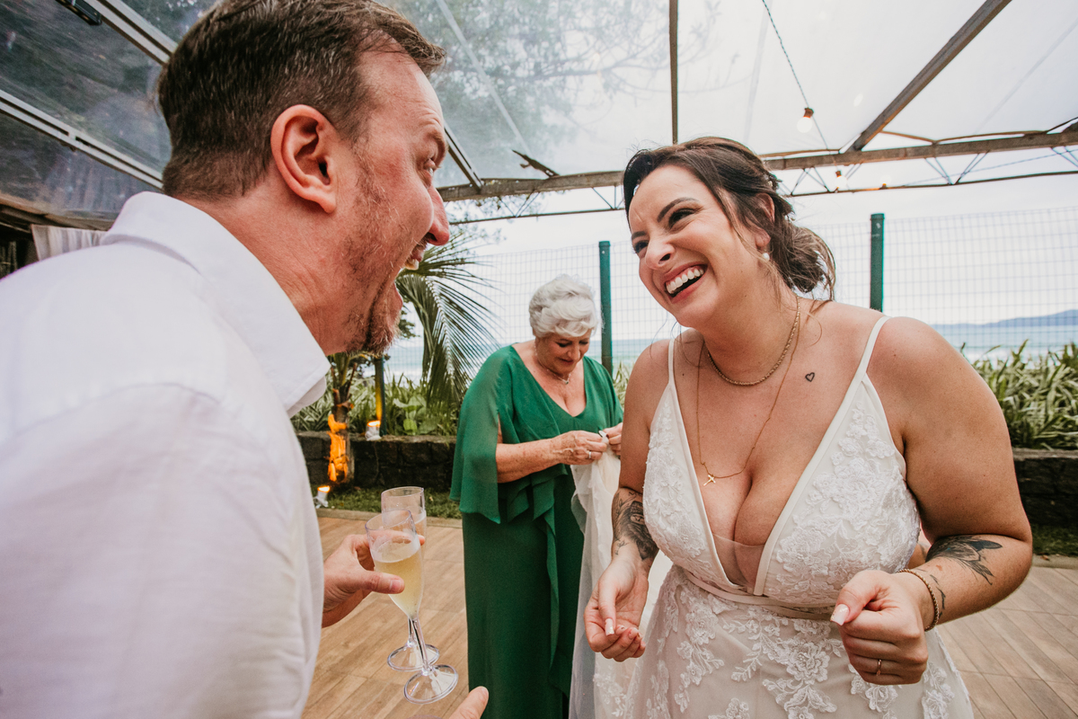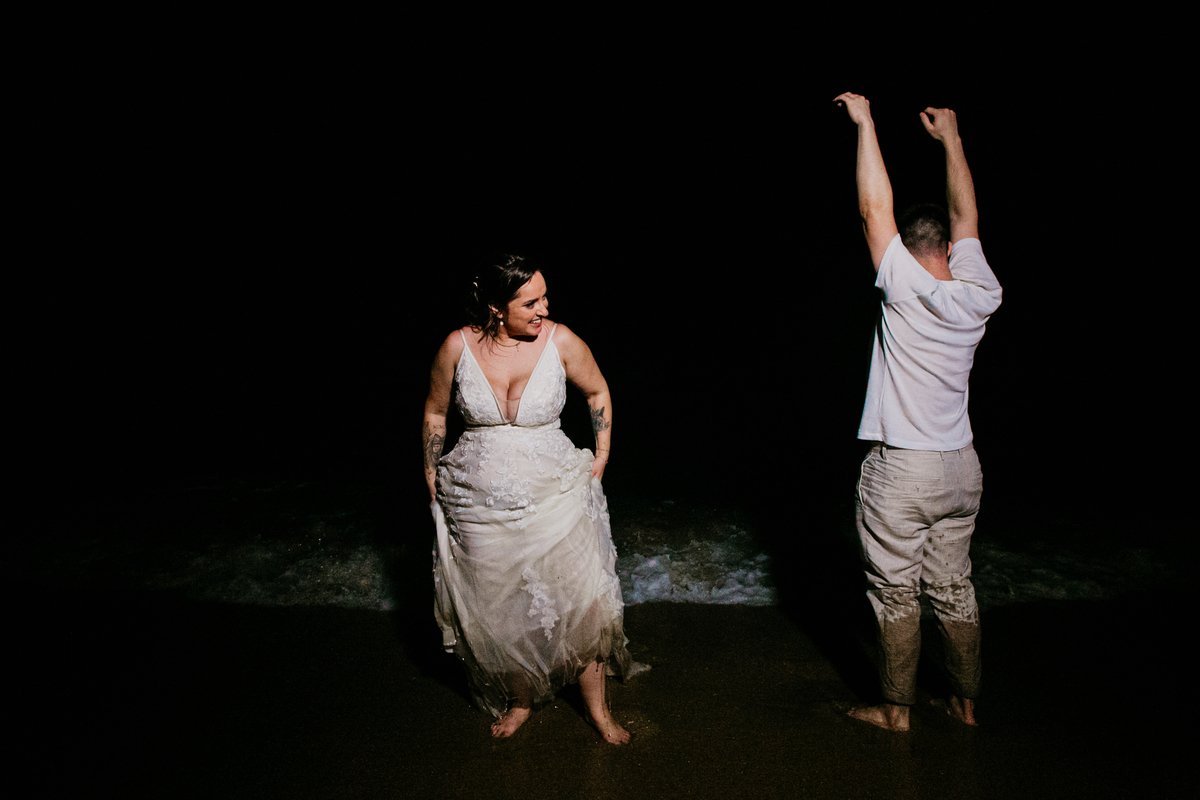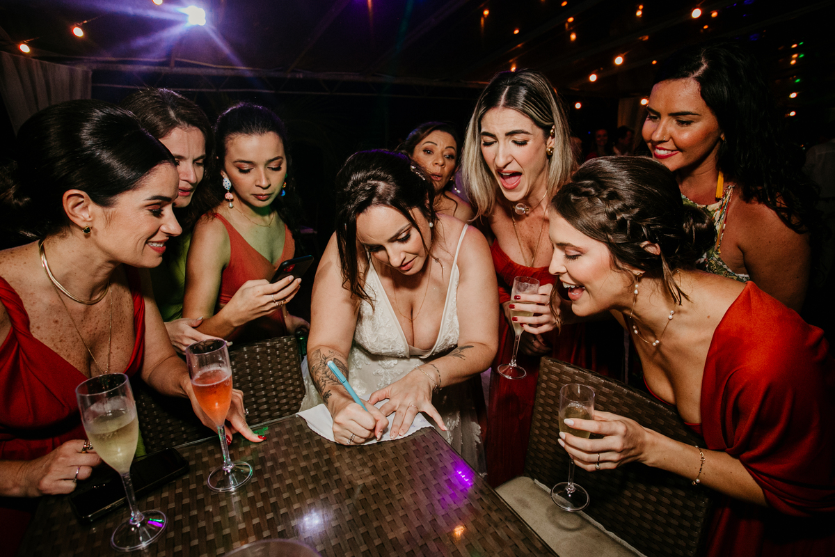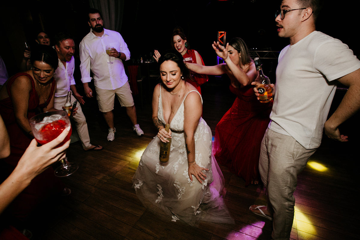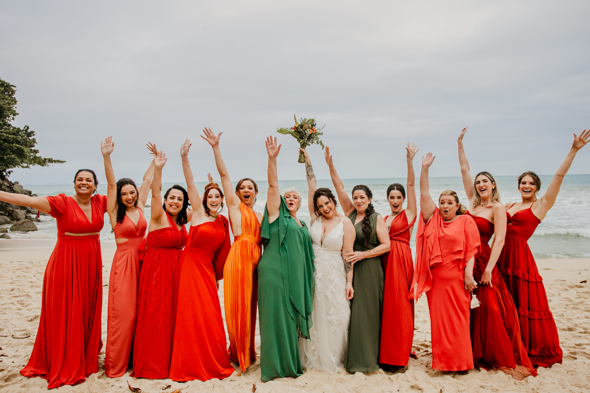 Apesar de ser uma festa pequena, a galera se jogou! Todos se divertiram como se não houvesse amanhã: muita bebida, risadas e aquela energia contagiante. Pra fechar o dia da melhor forma, o casal e os convidados foram direto para o mar, se molhar, curtir o momento e ainda pularam ondas, em uma vibe de renovação e boas energias.