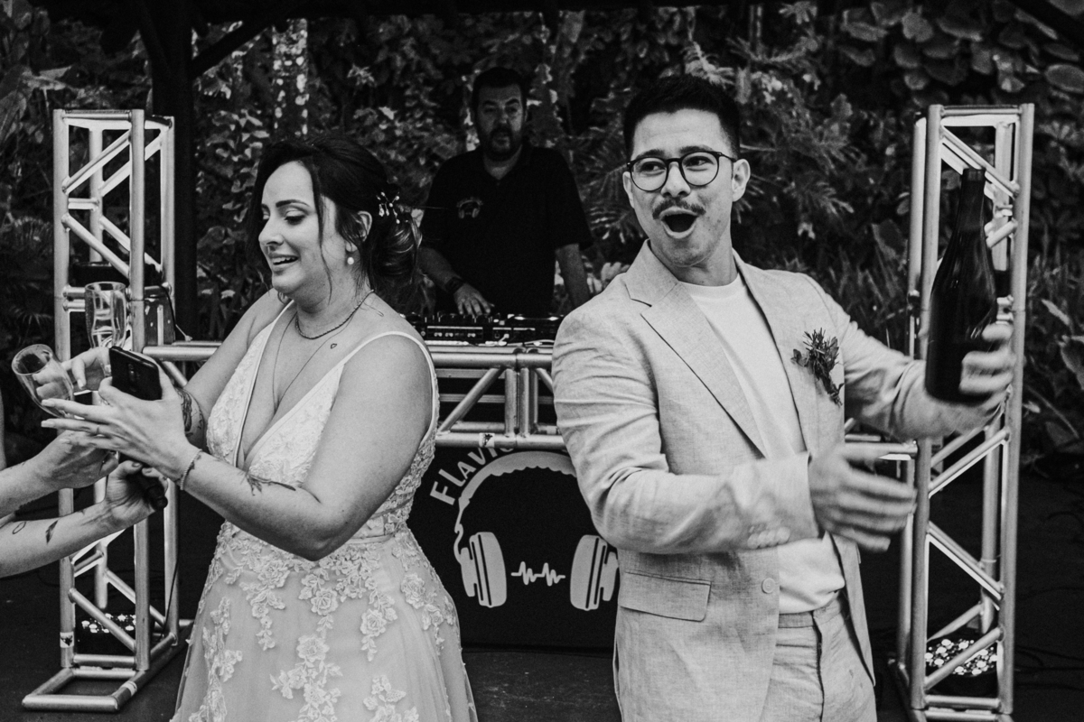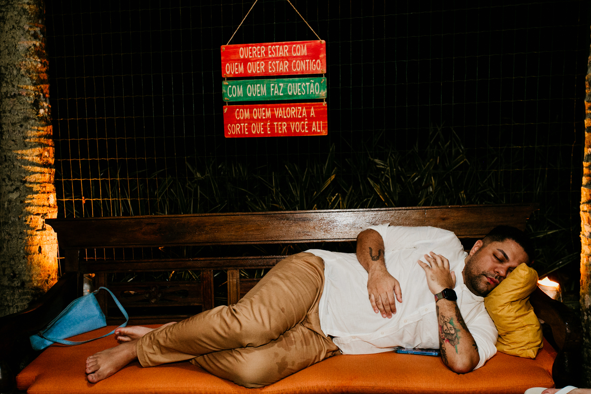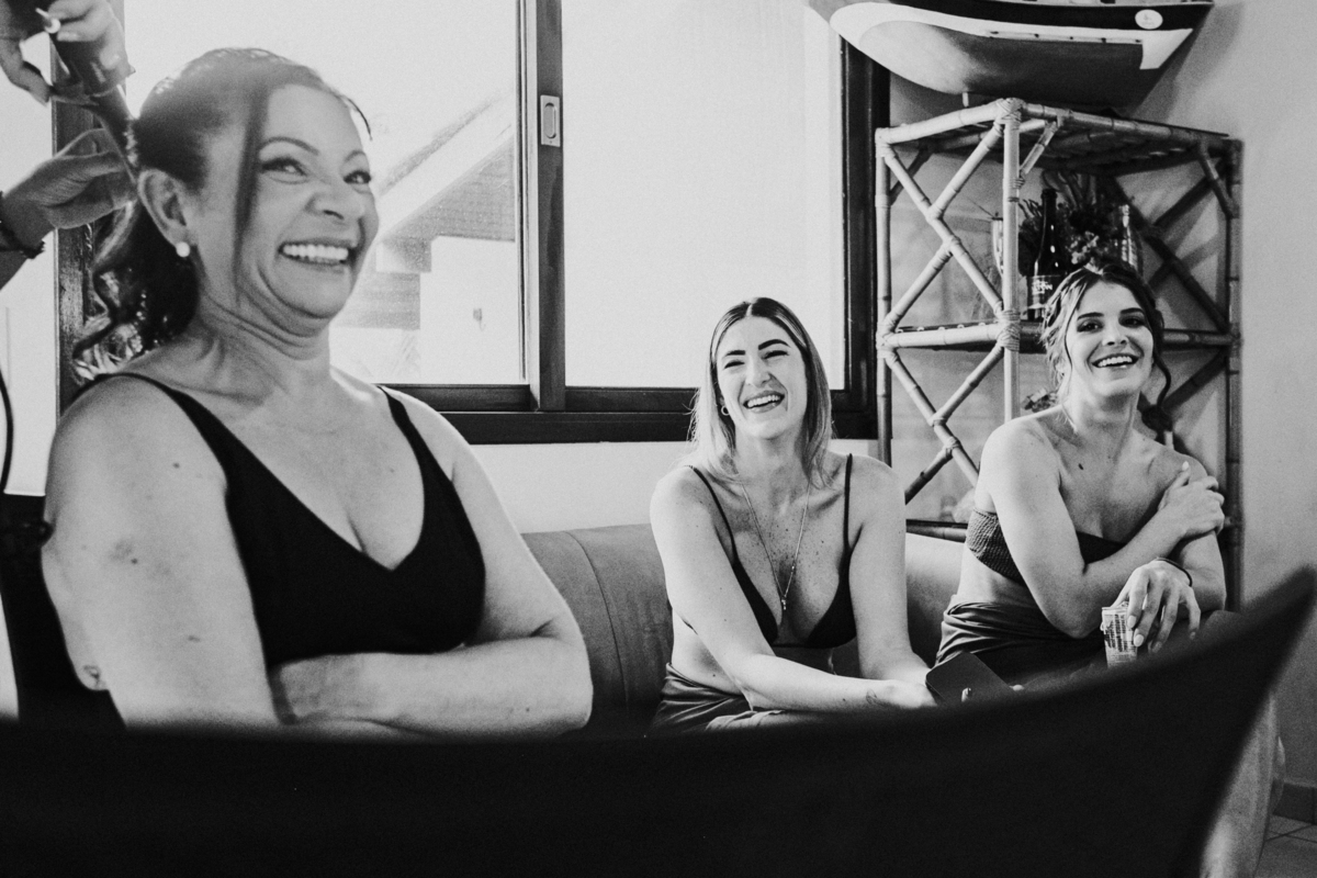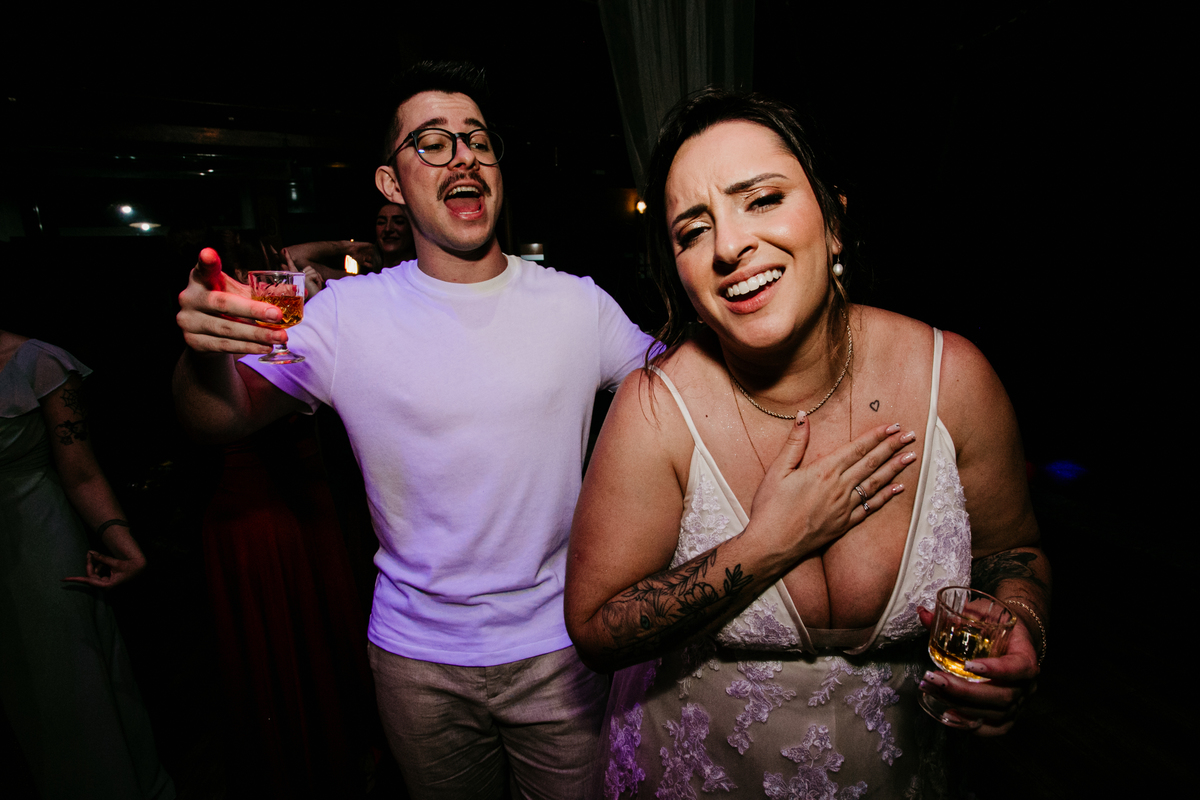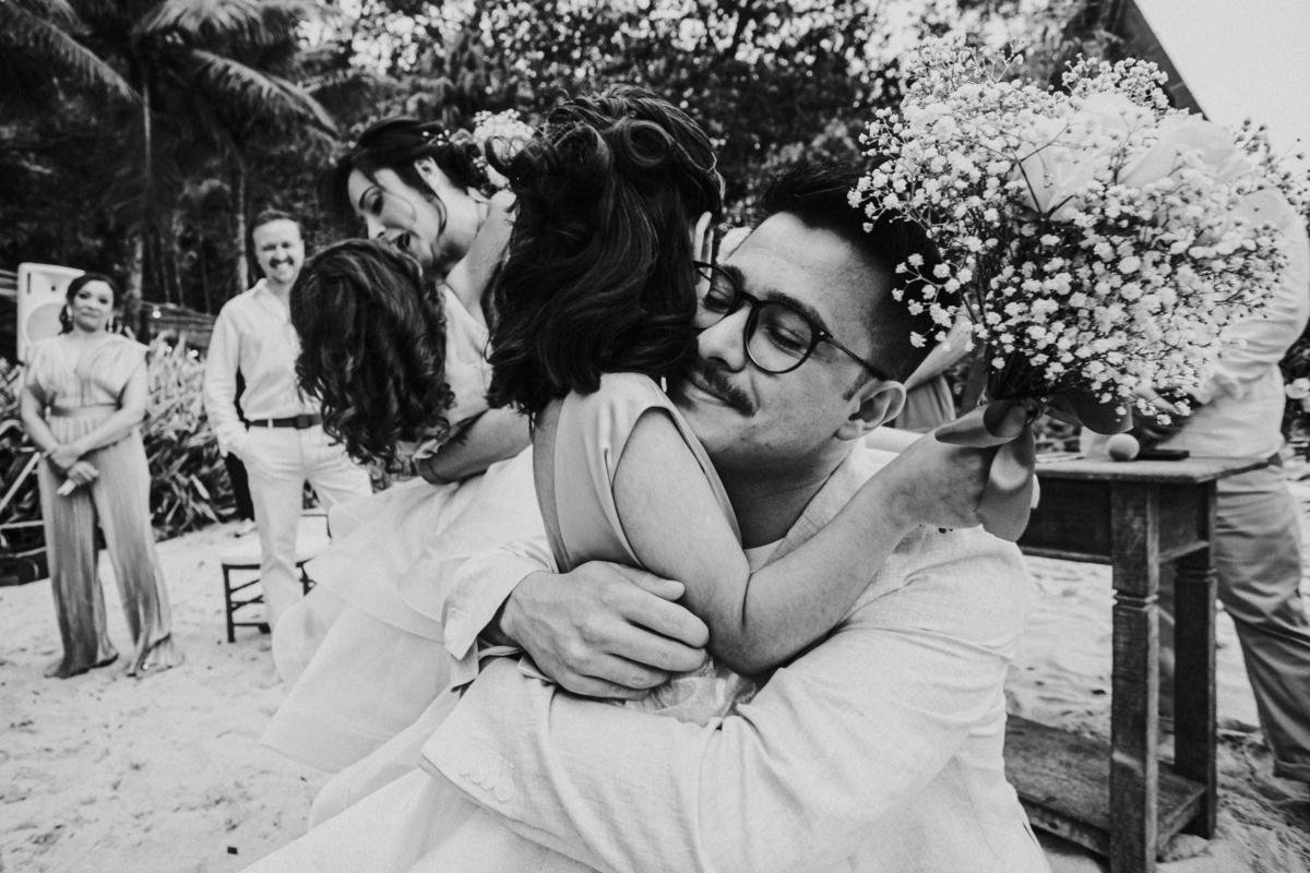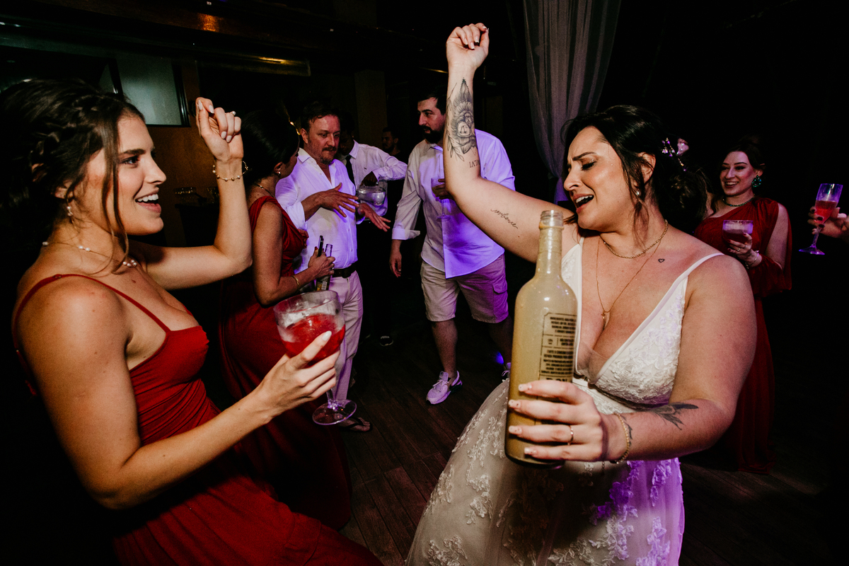 Apesar de ser uma festa pequena, a galera se jogou! Todos se divertiram como se não houvesse amanhã: muita bebida, risadas e aquela energia contagiante. Pra fechar o dia da melhor forma, o casal e os convidados foram direto para o mar, se molhar, curtir o momento e ainda pularam ondas, em uma vibe de renovação e boas energias.