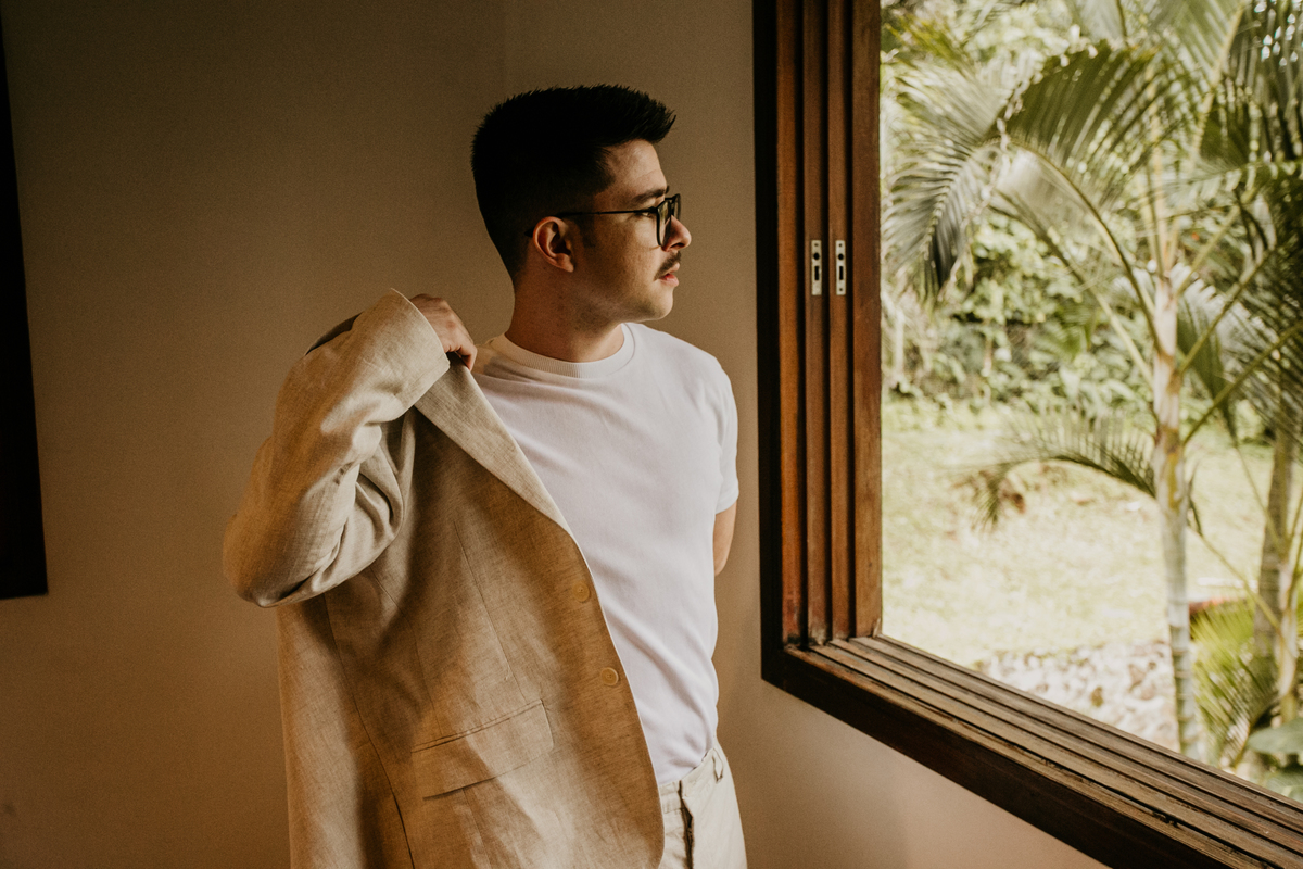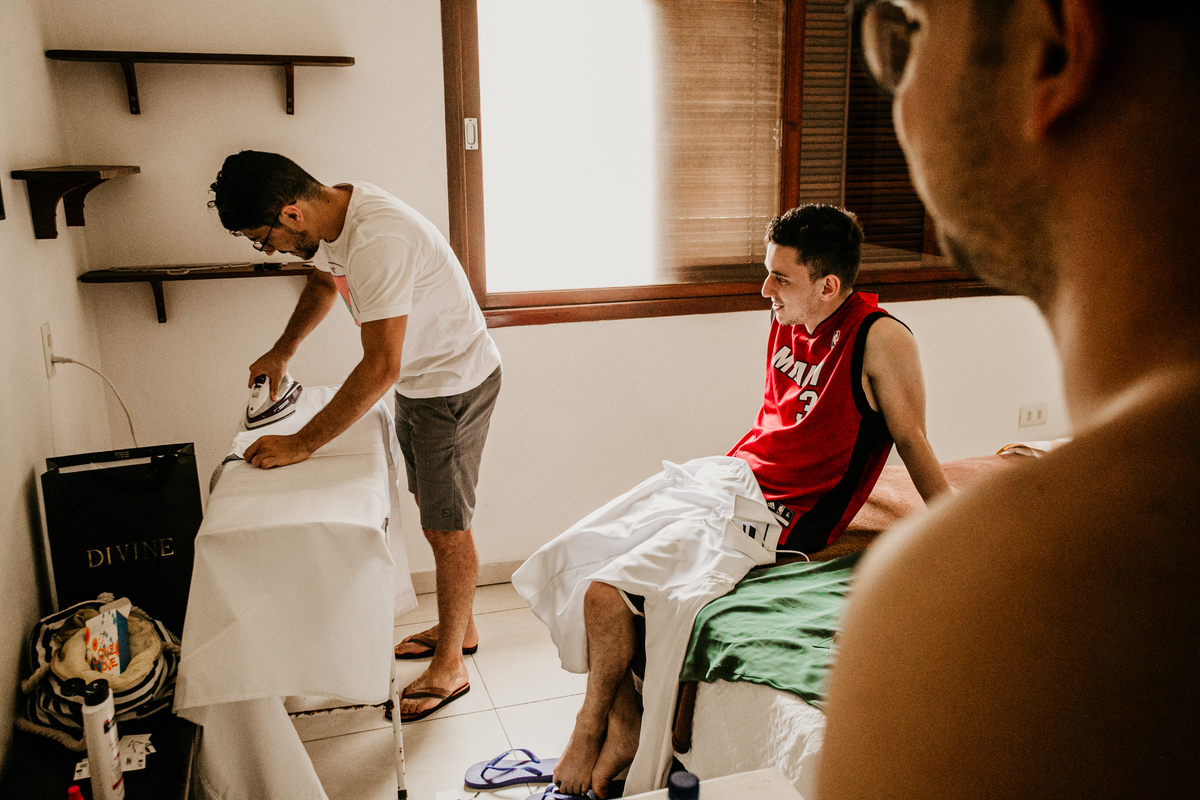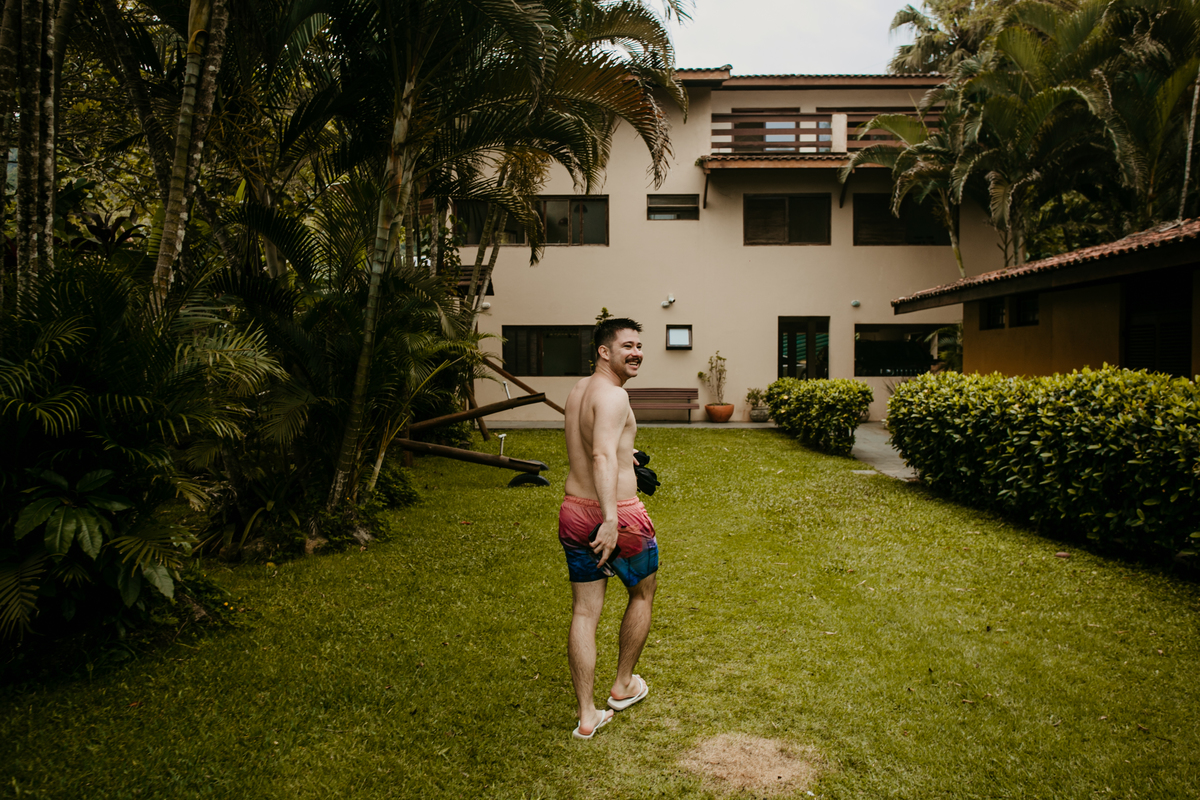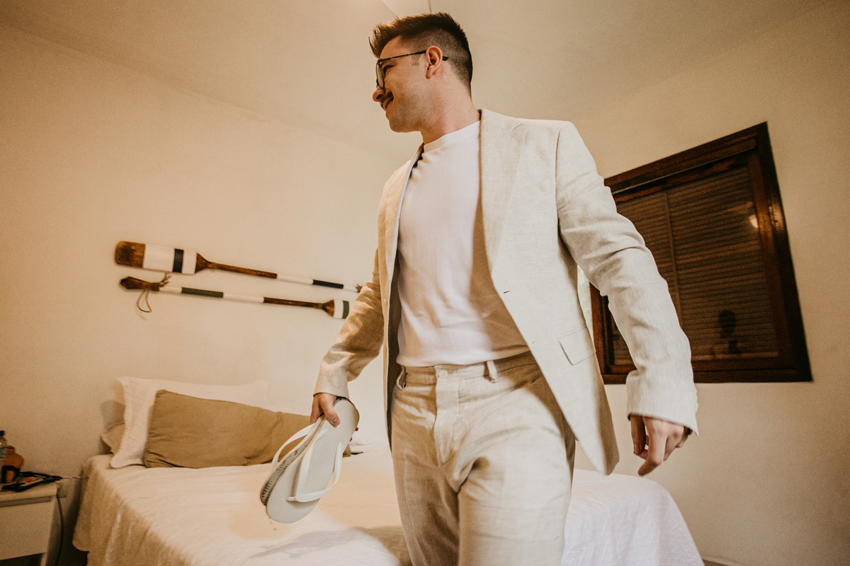 Ao chegarmos, o clima já era de total serenidade. Filipe, o noivo, aproveitando o mar, enquanto Mylene se preparava calmamente no making of.