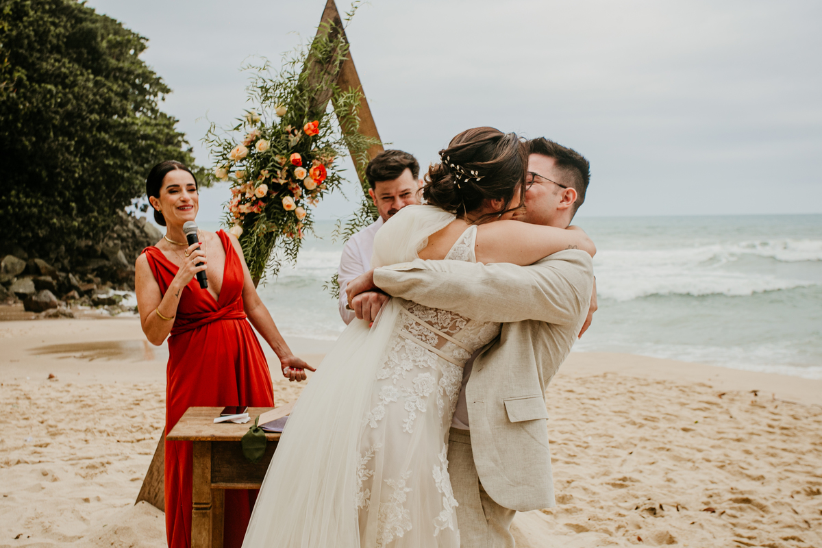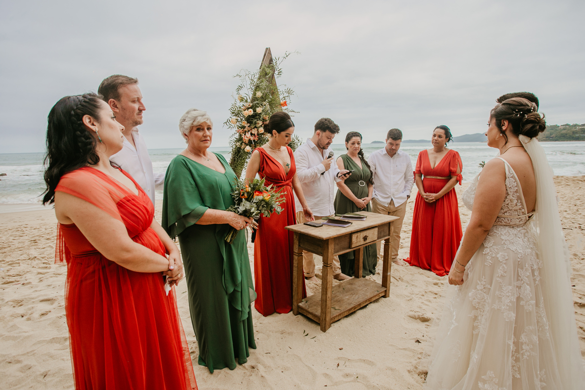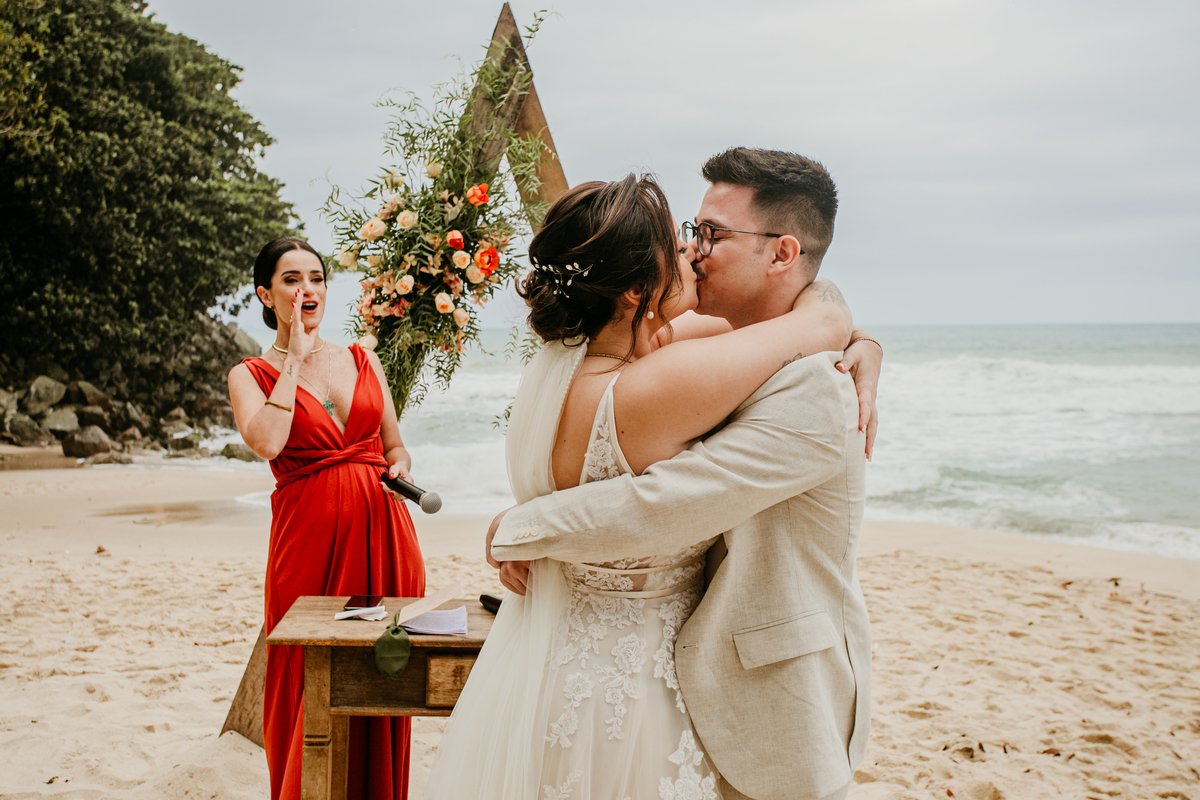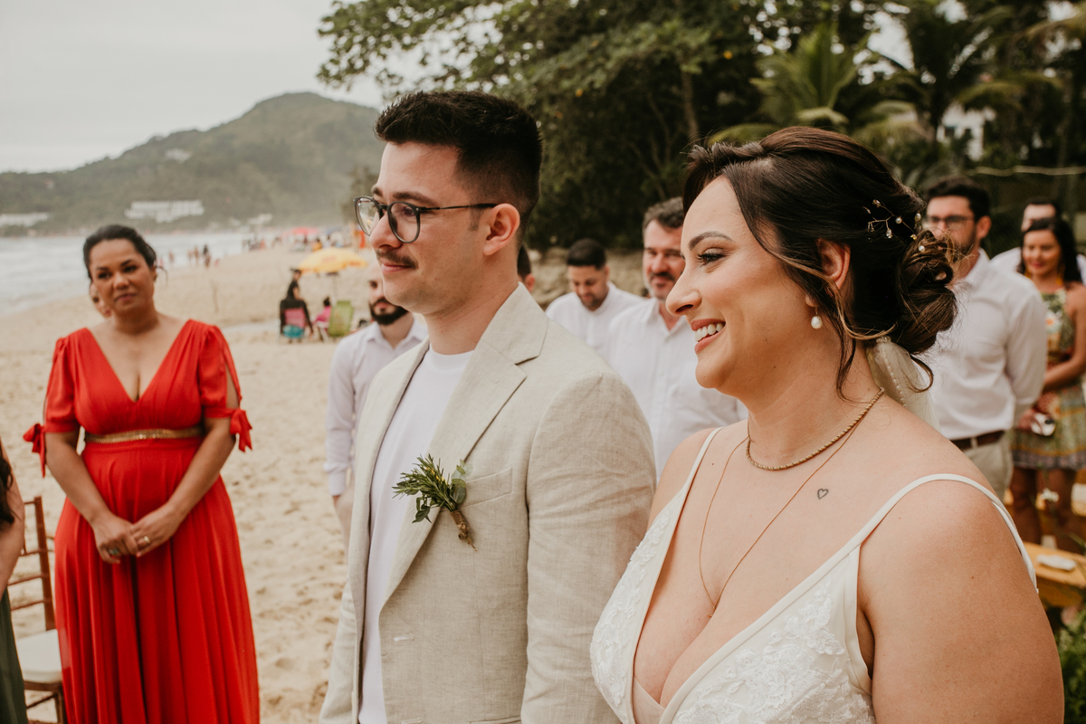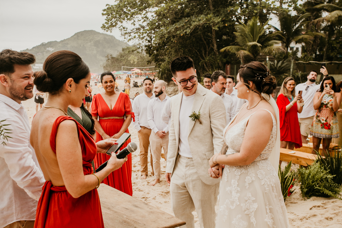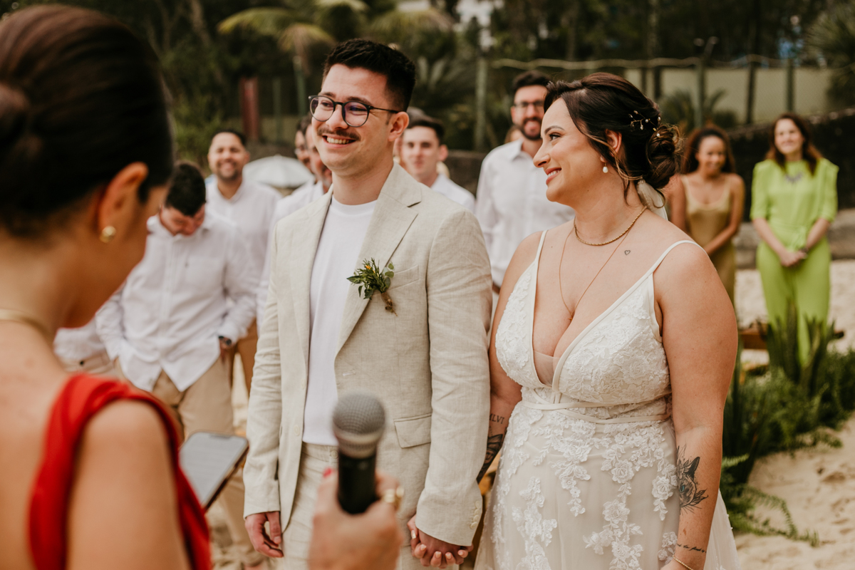 A cerimônia, com os pés na areia e o som das ondas ao fundo, foi um dos momentos mais marcantes do dia. Houve uma conexão profunda entre o casal, com olhares cheios de emoção e significado. Cada detalhe refletia a simplicidade e a beleza de um casamento à beira-mar.