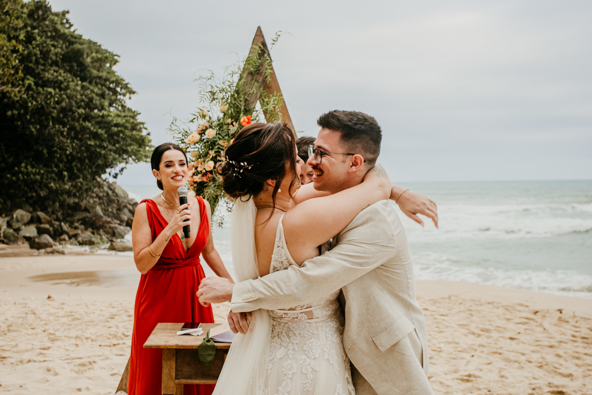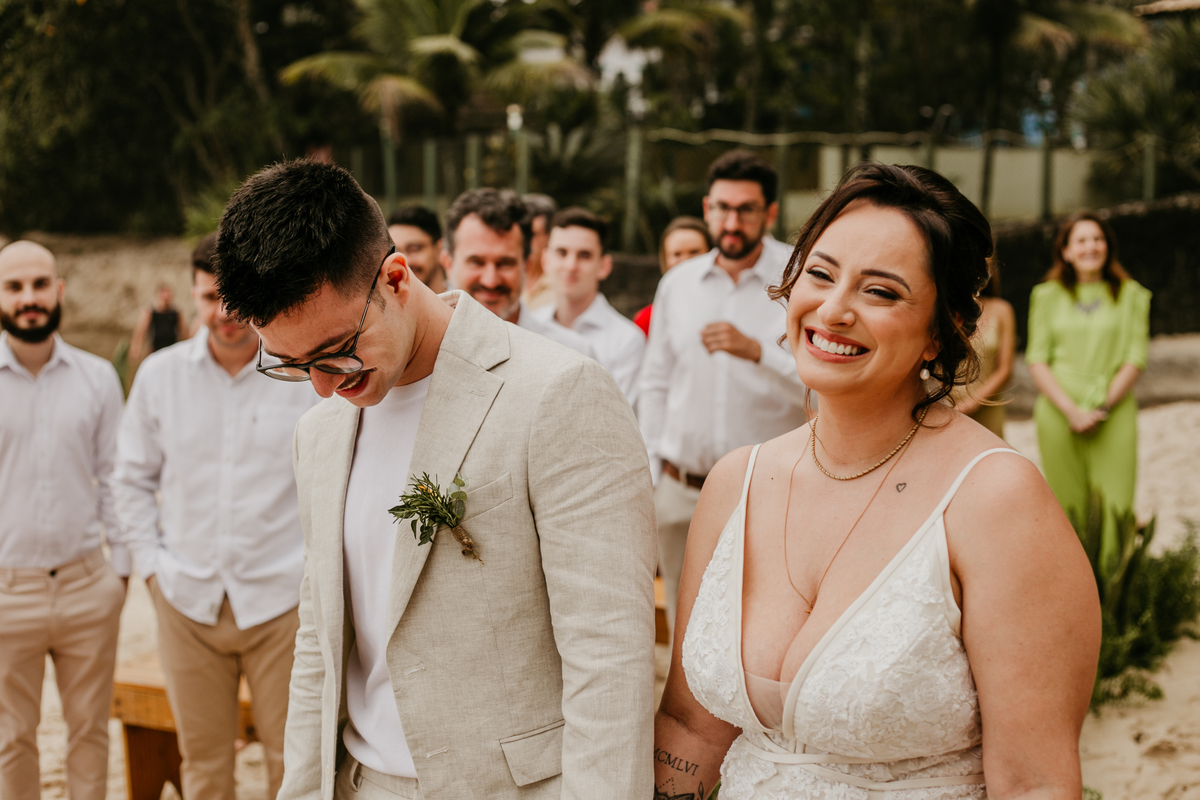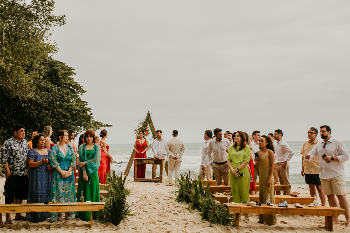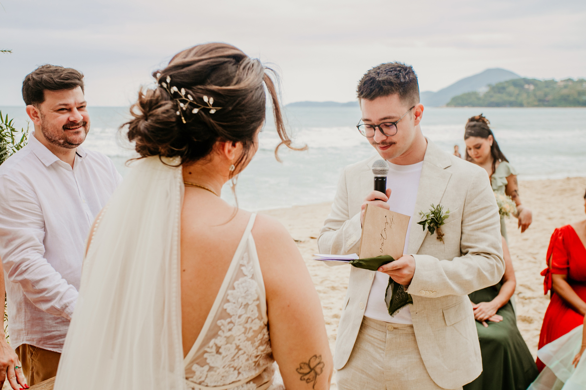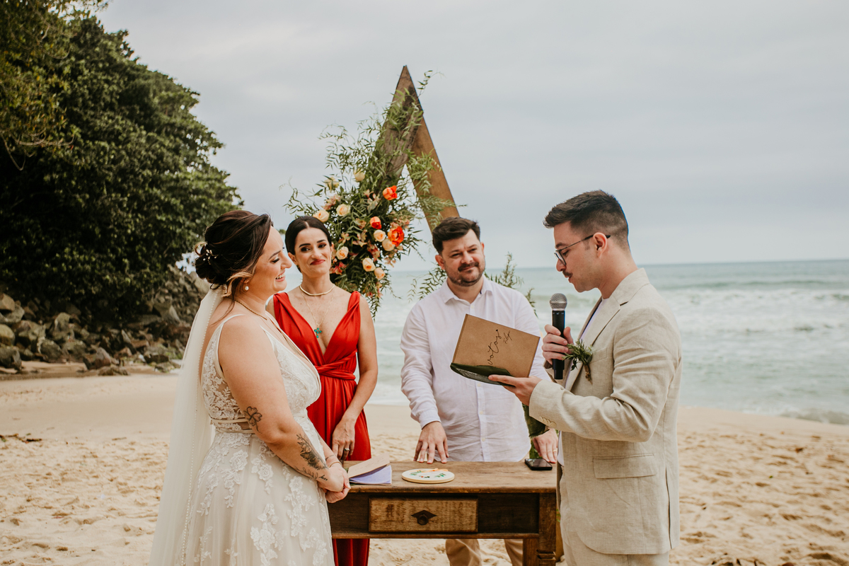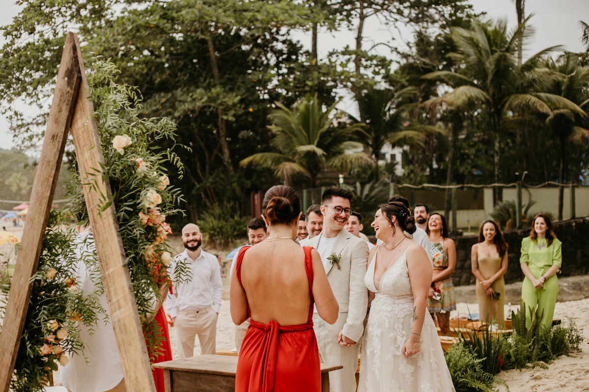 A cerimônia, com os pés na areia e o som das ondas ao fundo, foi um dos momentos mais marcantes do dia. Houve uma conexão profunda entre o casal, com olhares cheios de emoção e significado. Cada detalhe refletia a simplicidade e a beleza de um casamento à beira-mar.
