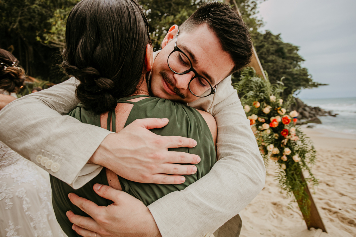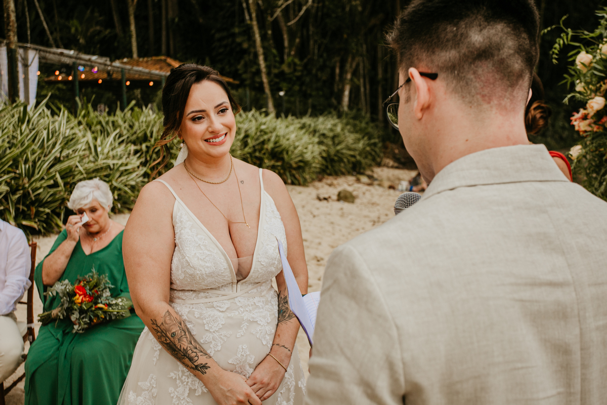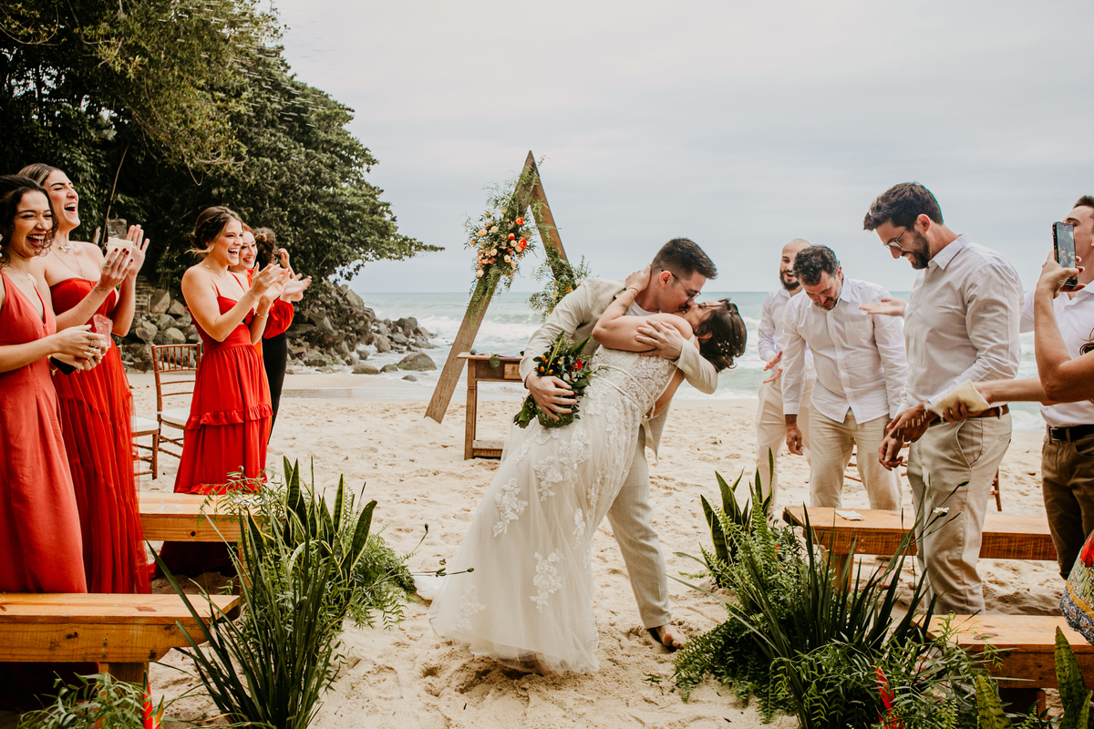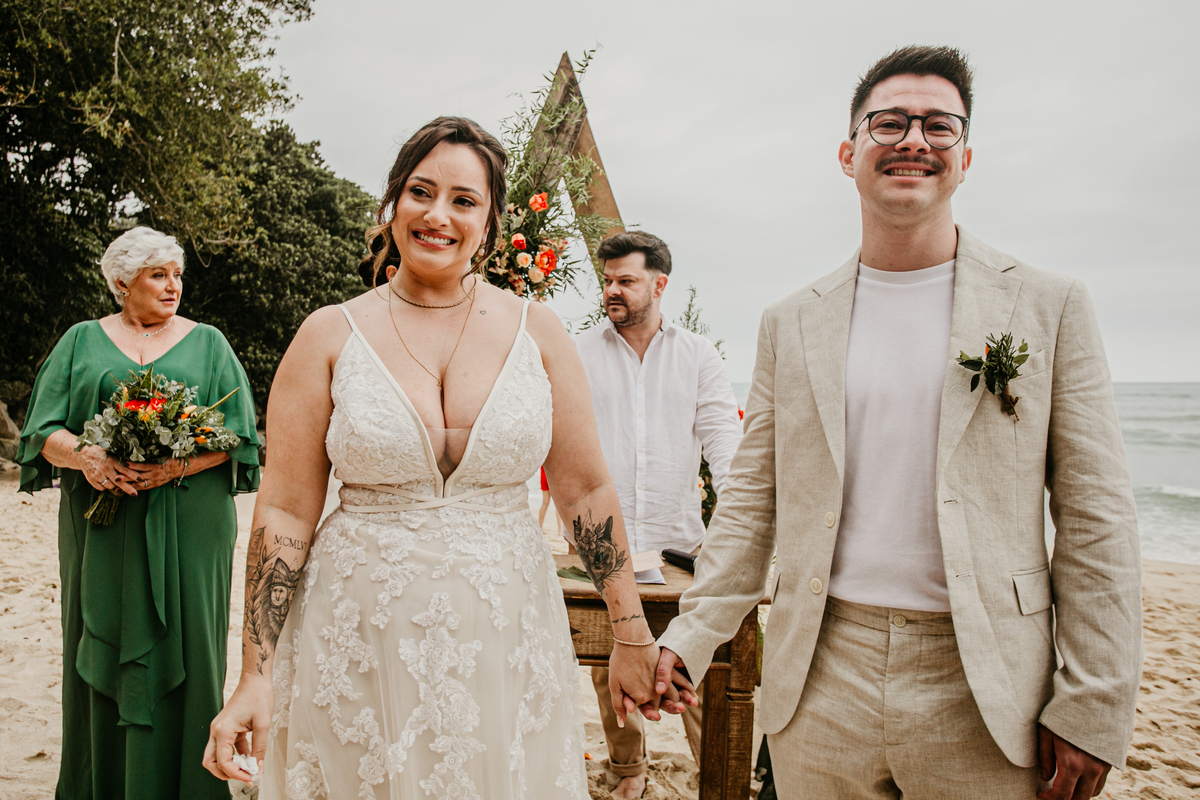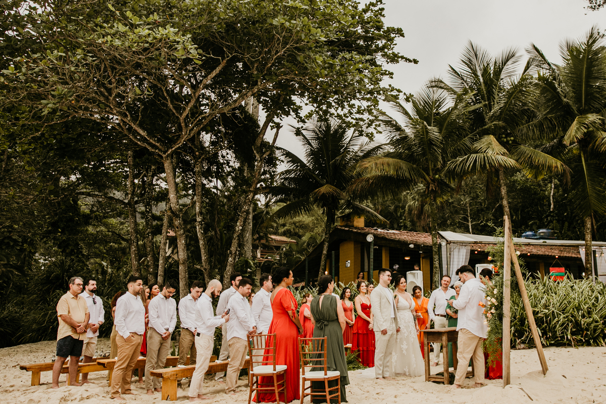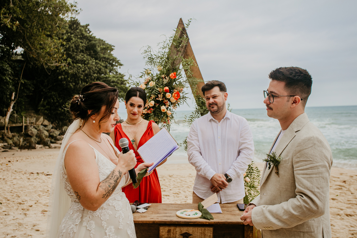 A cerimônia, com os pés na areia e o som das ondas ao fundo, foi um dos momentos mais marcantes do dia. Houve uma conexão profunda entre o casal, com olhares cheios de emoção e significado. Cada detalhe refletia a simplicidade e a beleza de um casamento à beira-mar.
