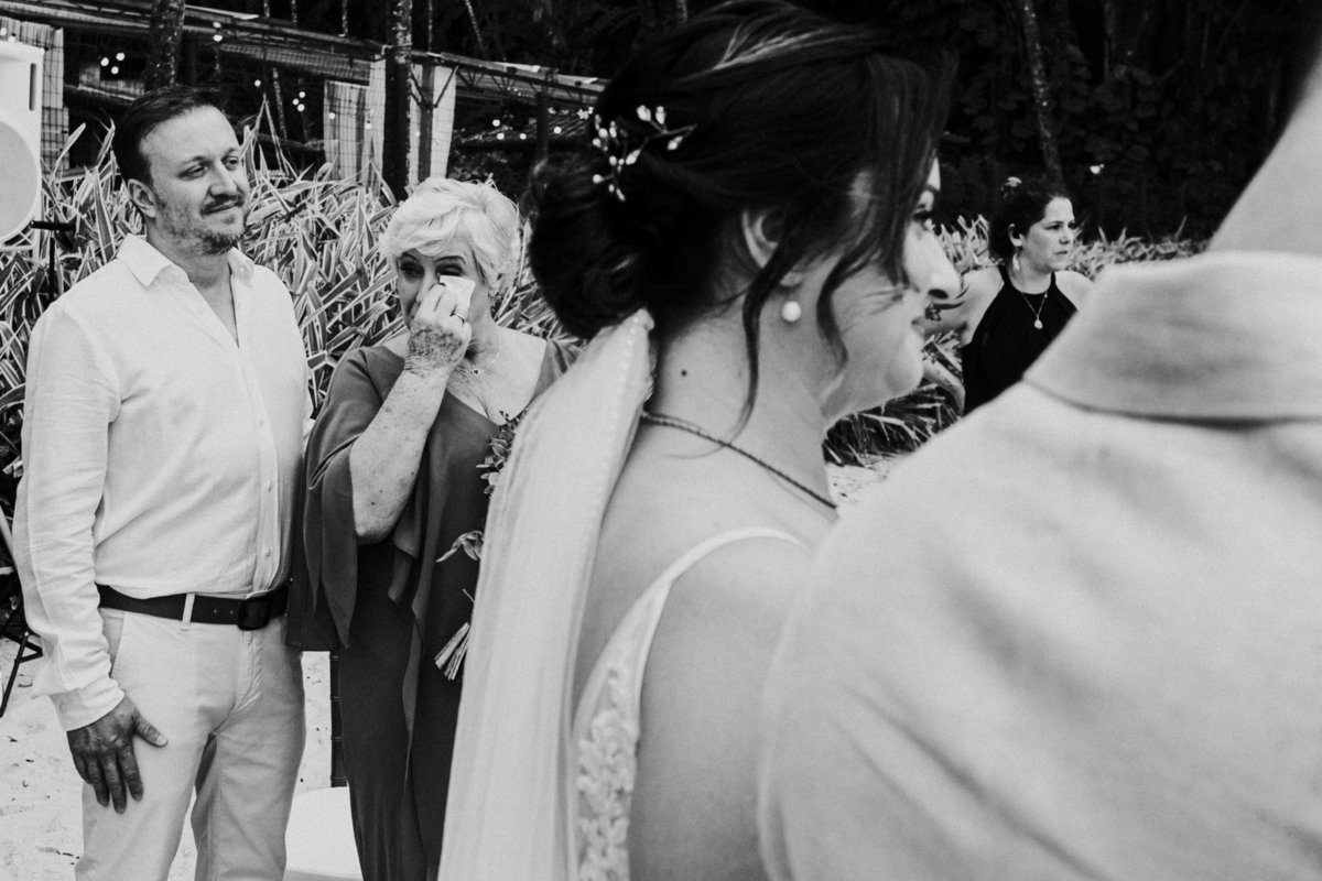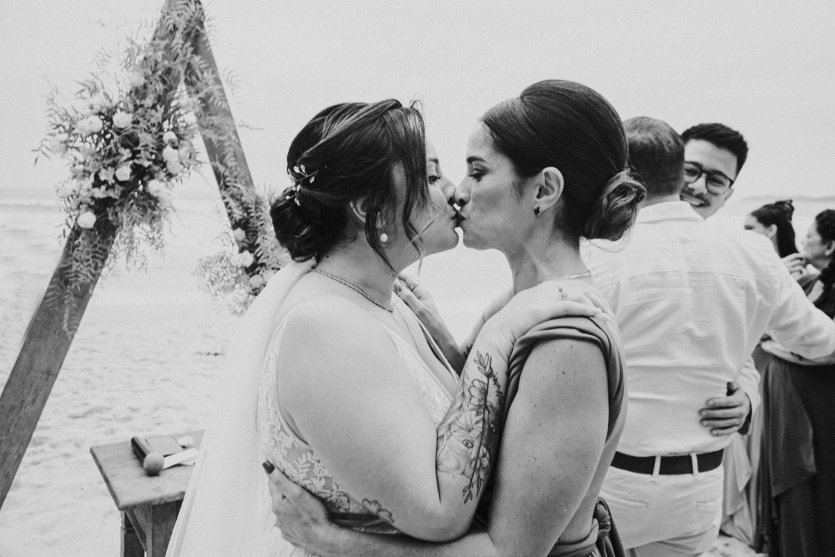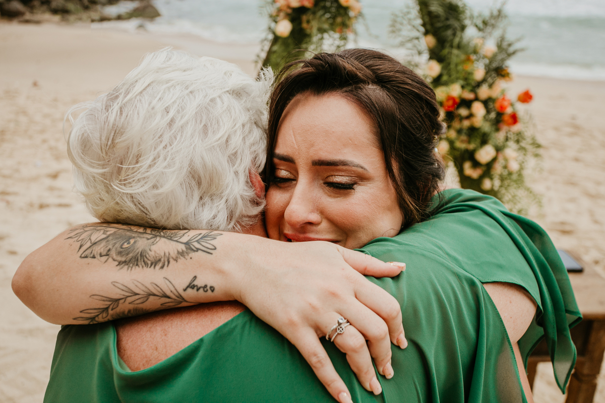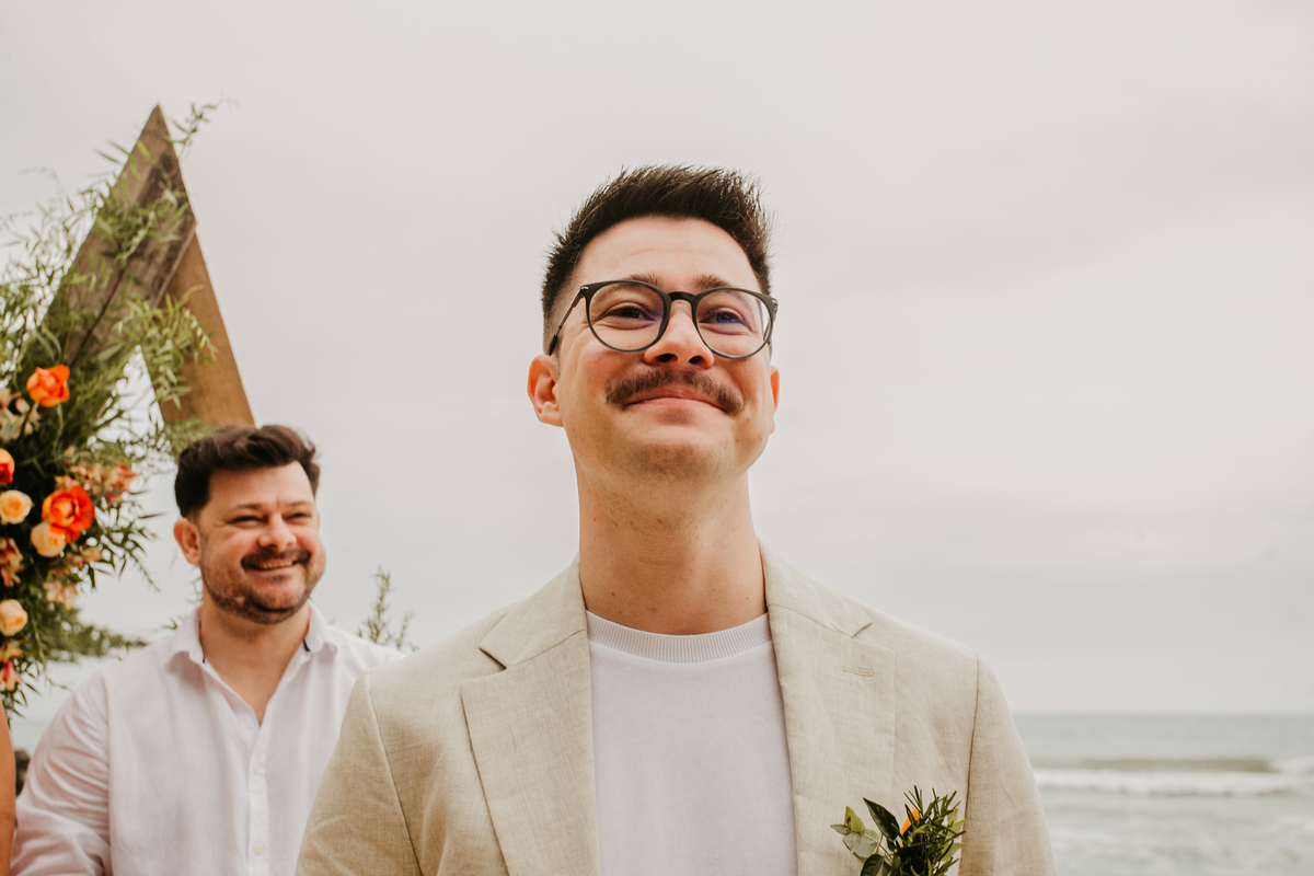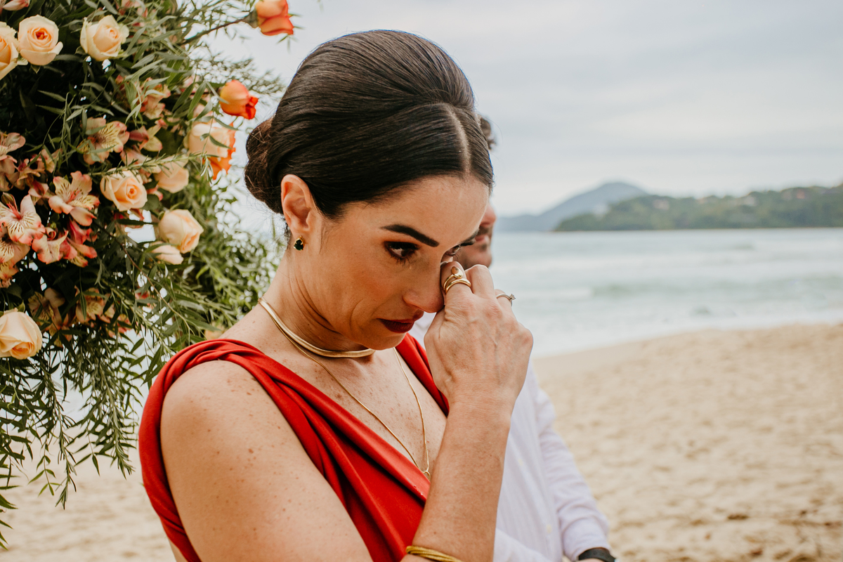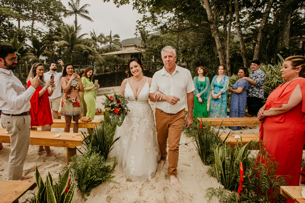 A cerimônia, com os pés na areia e o som das ondas ao fundo, foi um dos momentos mais marcantes do dia. Houve uma conexão profunda entre o casal, com olhares cheios de emoção e significado. Cada detalhe refletia a simplicidade e a beleza de um casamento à beira-mar.