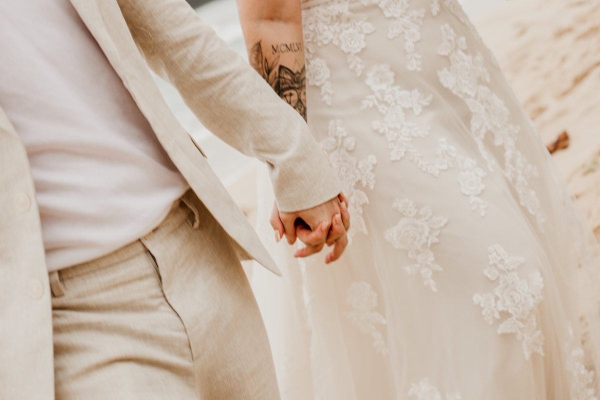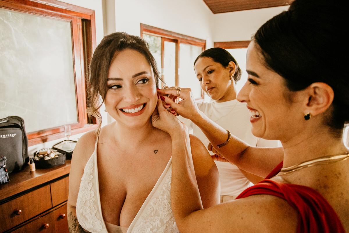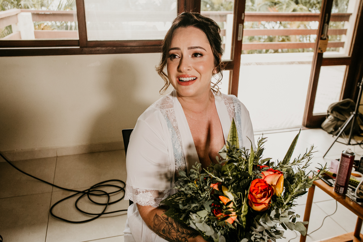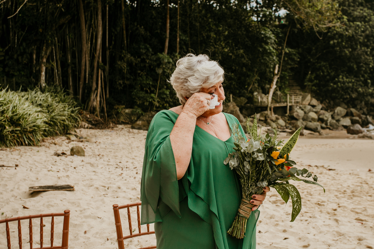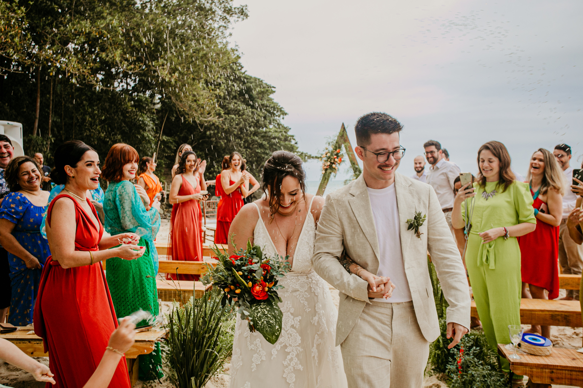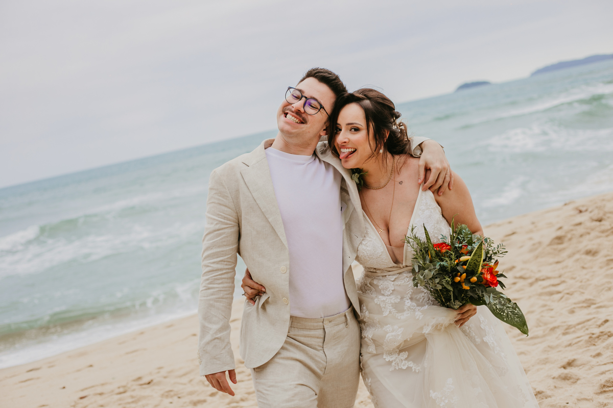 A cerimônia, com os pés na areia e o som das ondas ao fundo, foi um dos momentos mais marcantes do dia. Houve uma conexão profunda entre o casal, com olhares cheios de emoção e significado. Cada detalhe refletia a simplicidade e a beleza de um casamento à beira-mar.