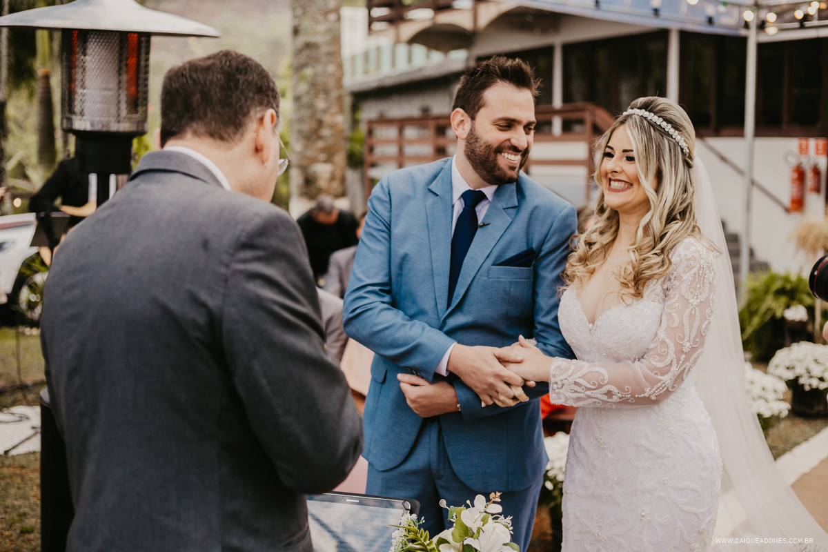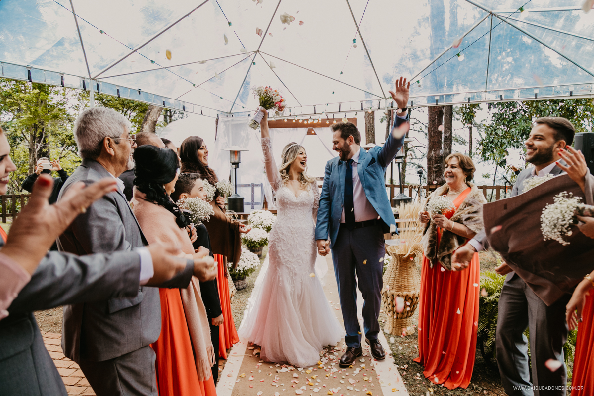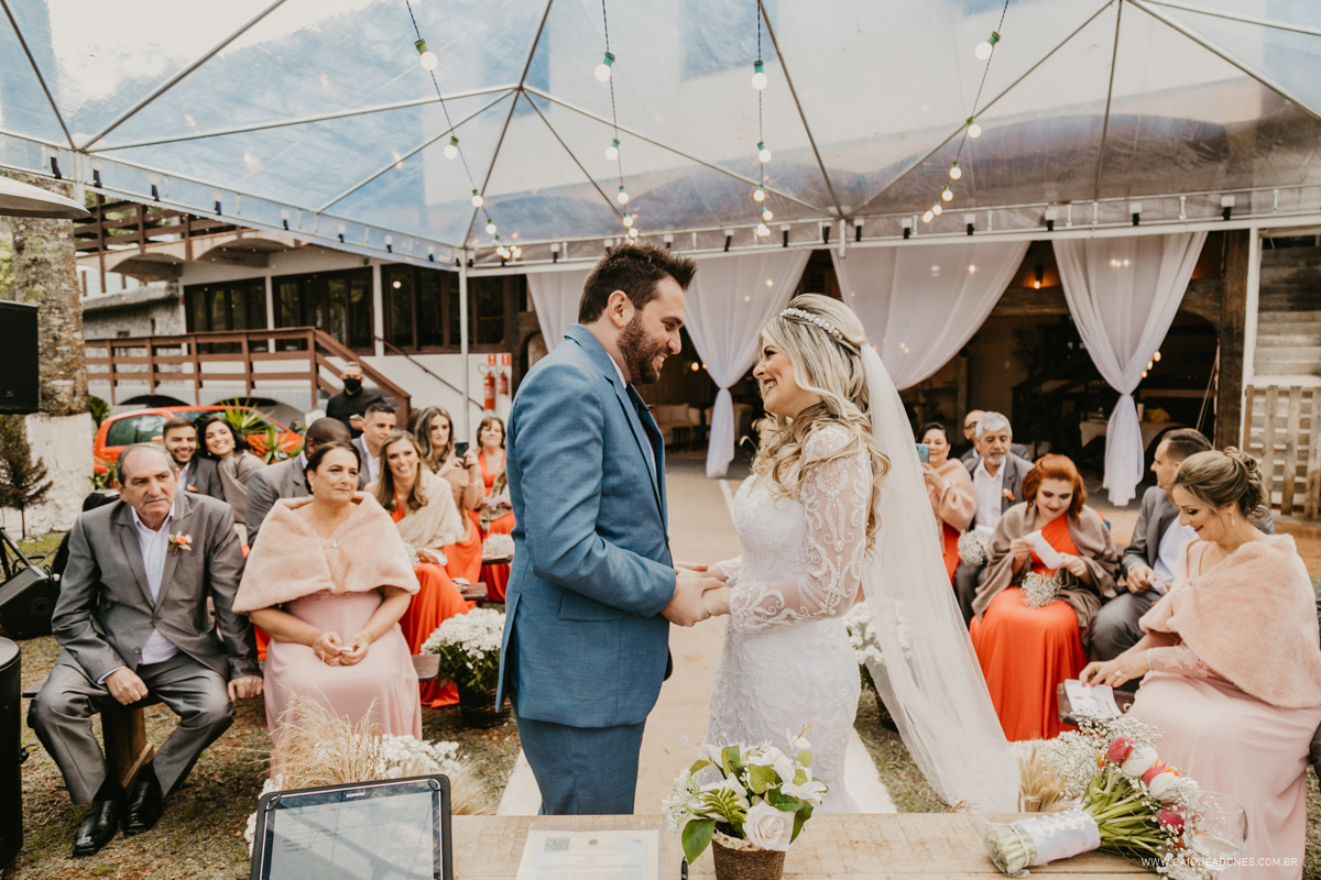 São os noivos, celebrante e no máximo, os pais e irmãos. Onde o principal, é o amor, a troca e a cumplicidade.